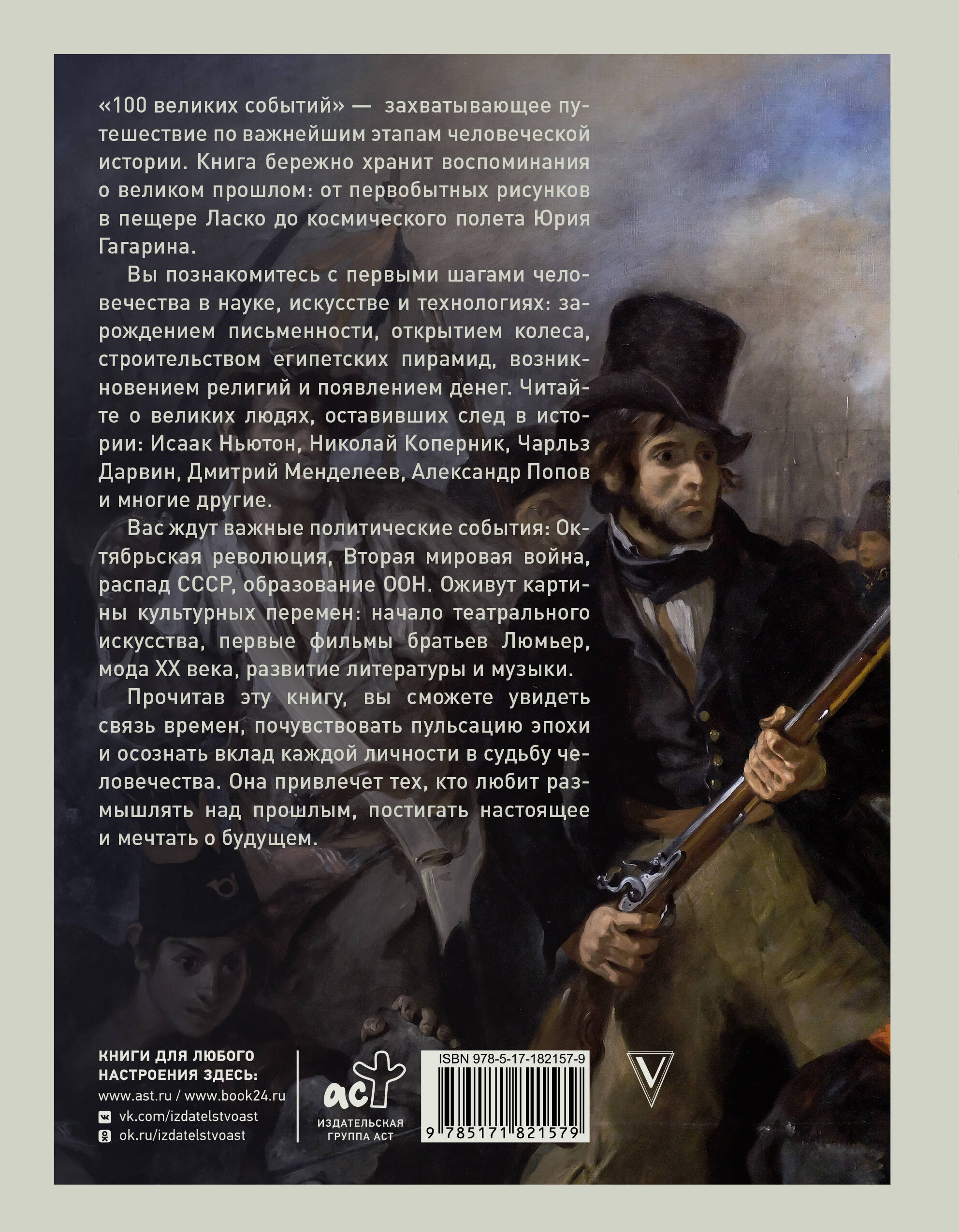 "100 великих событий" — захватывающее путешествие по важнейшим этапам человеческой истории. Книга бережно хранит воспоминания о великом прошлом: от первобытных рисунков в пещере Ласко до космического полета Юрия Гагарина.