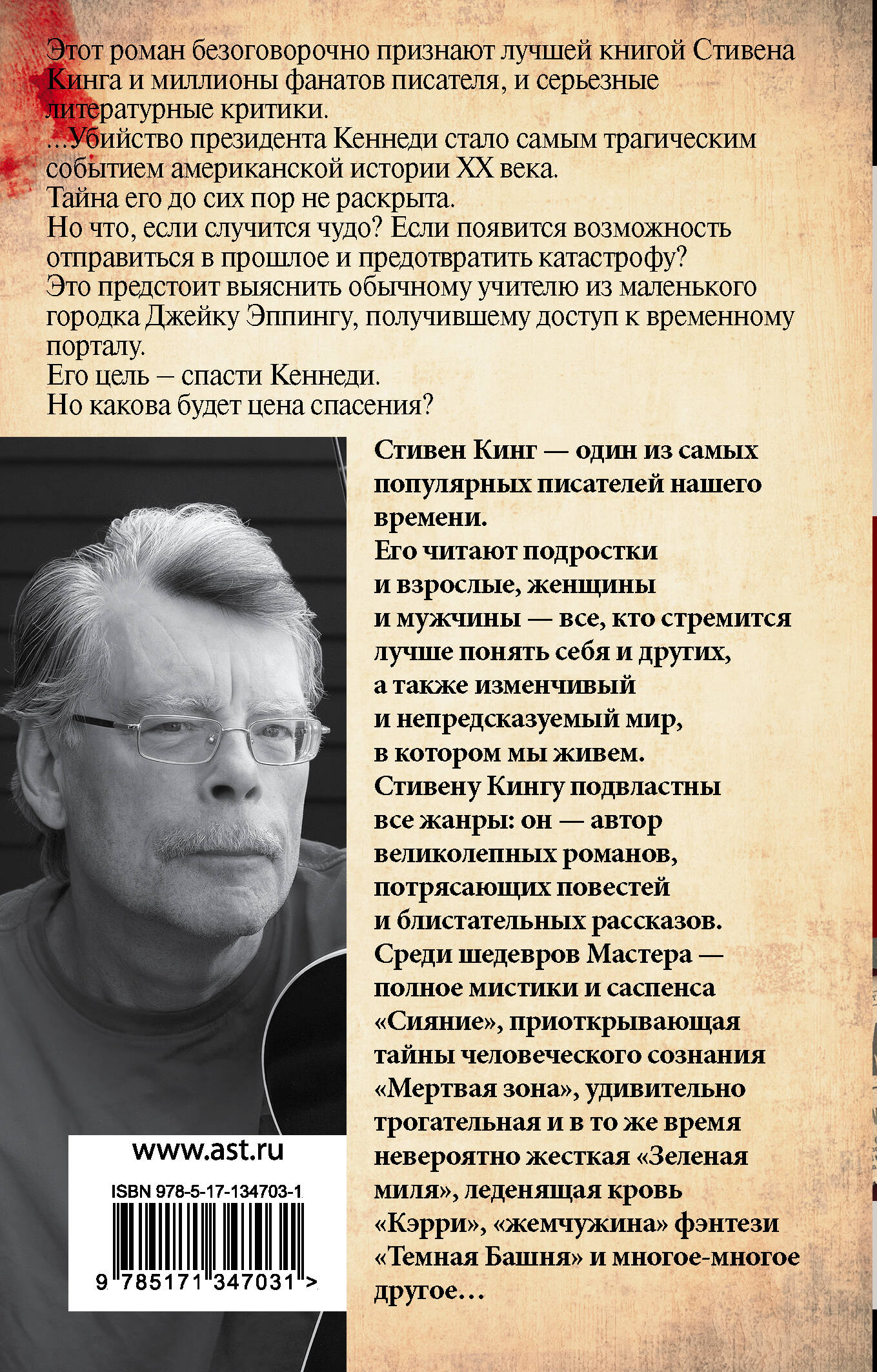 • «11/22/63» – это книга, которая перенесет вас в маленький американский городок, где обычный учитель Джейк Эппинг получает доступ к временному порталу и отправляется в прошлое, чтобы спасти жизнь президента Кеннеди. Узнайте вместе с ним, возможно ли изменить историю и предотвратить трагедию.