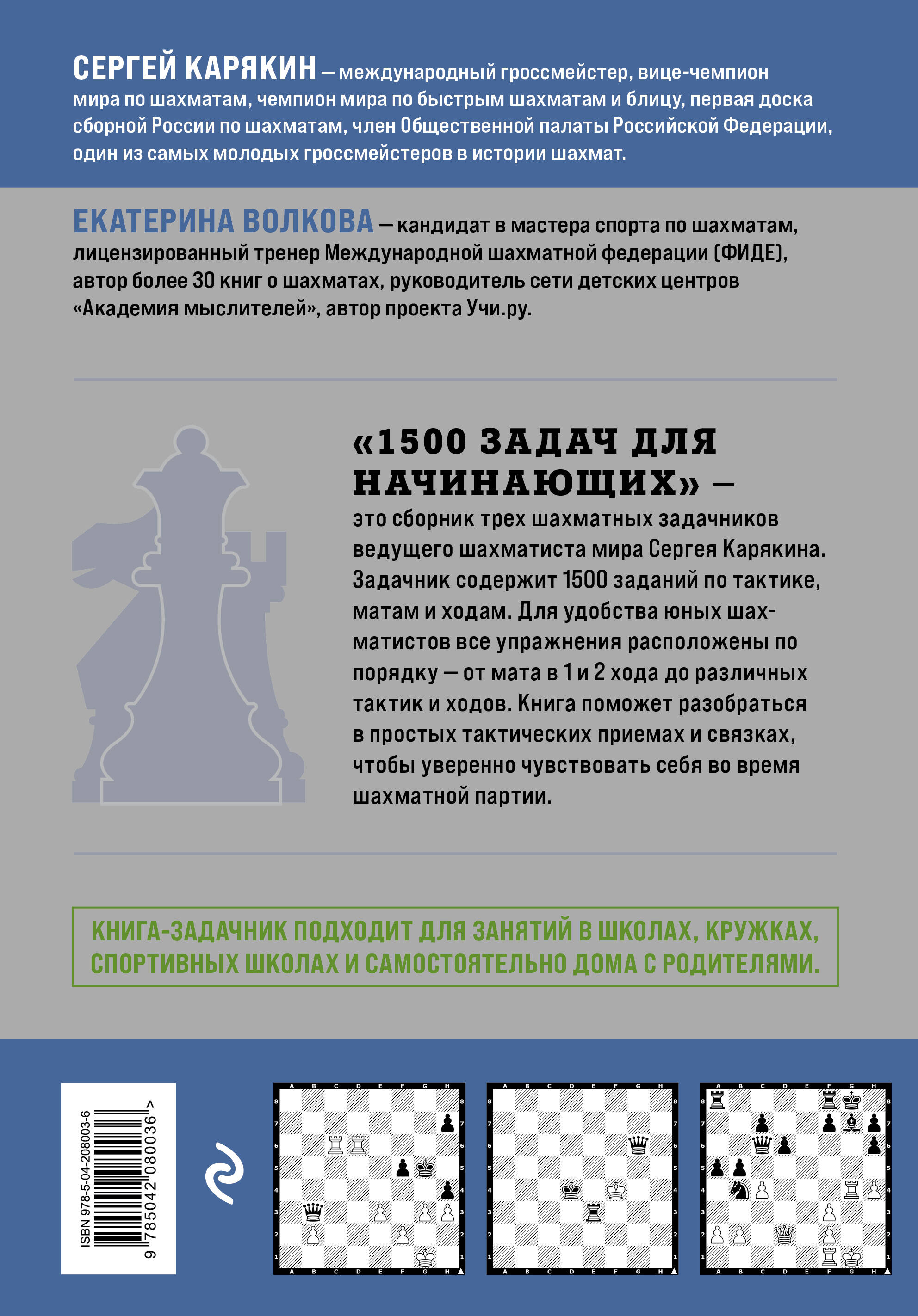 «1500 ЗАДАЧ ДЛЯ НАЧИНАЮЩИХ» — это сборник трех шахматных задачников ведущего шахматиста мира Сергея Карякина.