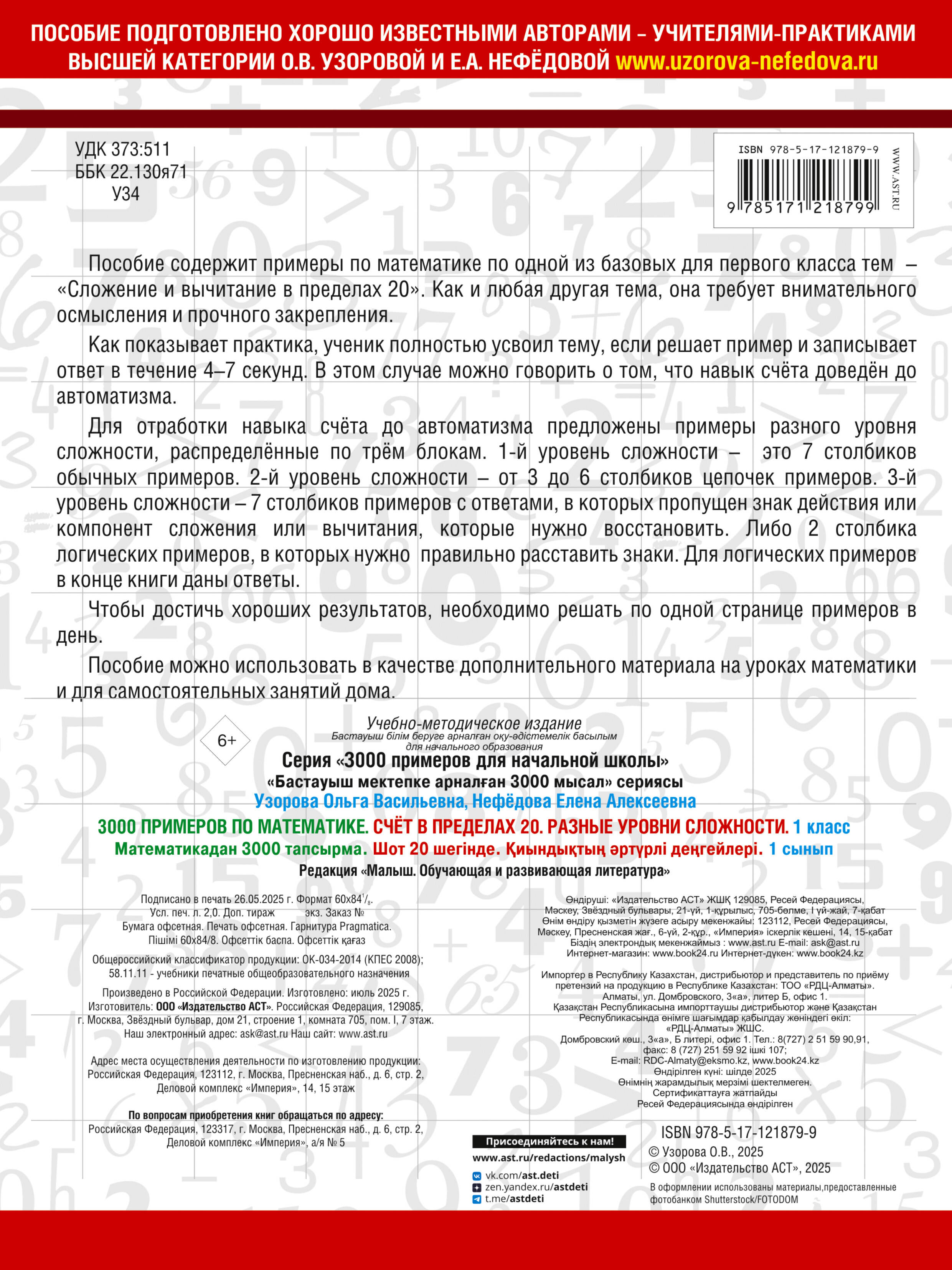 Для отработки навыка счёта до автоматизма предложены примеры разного уровня сложности, распределенные по трём блокам. 1-й уровень сложности – это 7 столбиков обычных примеров. 2-й уровень сложности – от 3 до 6 столбиков цепочек примеров. 3-й уровень сложности – 7 столбиков примеров с ответами, в которых пропущен знак действия или компонент сложения или вычитания, которые нужно восстановить. Либо 2 столбика логических примеров, в которых нужно правильно расставить знаки. Для логических примеров в конце книги даны ответы.