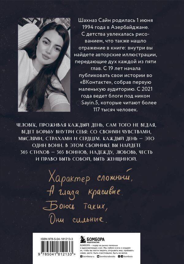 «365 воинов внутри меня» — это сборник молодой поэтессы Шахназ Сайн. Она начала опубликовать свои истории во «ВКонтакте» с 19 лет, собрав первую маленькую аудиторию. Позже ее узнали как автора тонких лирических романов «Таха», «На периферии», «Дороже вдоха», серии историй «Раз и Навсегда..», а ее стихи легли в основу многих песен, в том числе Миши Марвина.