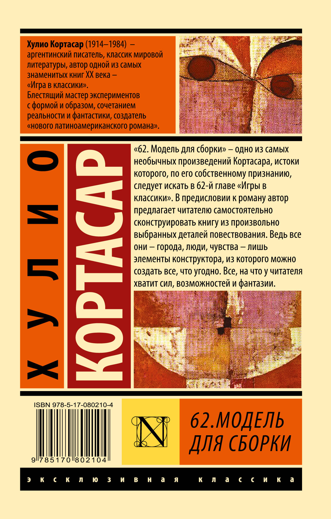 "62. Модель для сборки" – одно из самых необычных произведений Кортасара, истоки которого, по его собственному признанию, следует искать в 62-й главе "Игры в классики". В предисловии к роману автор предлагает читателю самостоятельно сконструировать книгу из произвольно выбранных деталей повествования. Ведь все они – города, люди, чувства – лишь элементы конструктора, из которого можно создать все что угодно. Все, на что у читателя хватит сил, возможностей и фантазии.