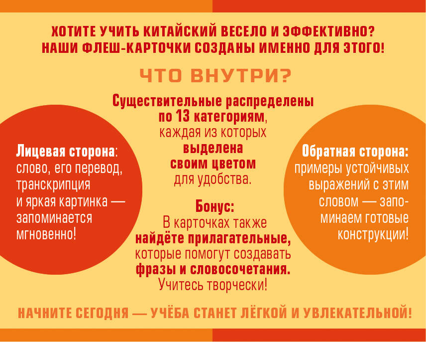 На лицевой стороне каждой карточки размещены слово на китайском языке, его перевод, транскрипция пиньинь и яркая картинка для упрощения запоминания. На обратной стороне — примеры употребления слова в контексте. Таким образом вы не только выучите лексику, но и сможете использовать её в речи. Слова разделены на 13 категорий, каждая из которых выделена своим цветом.