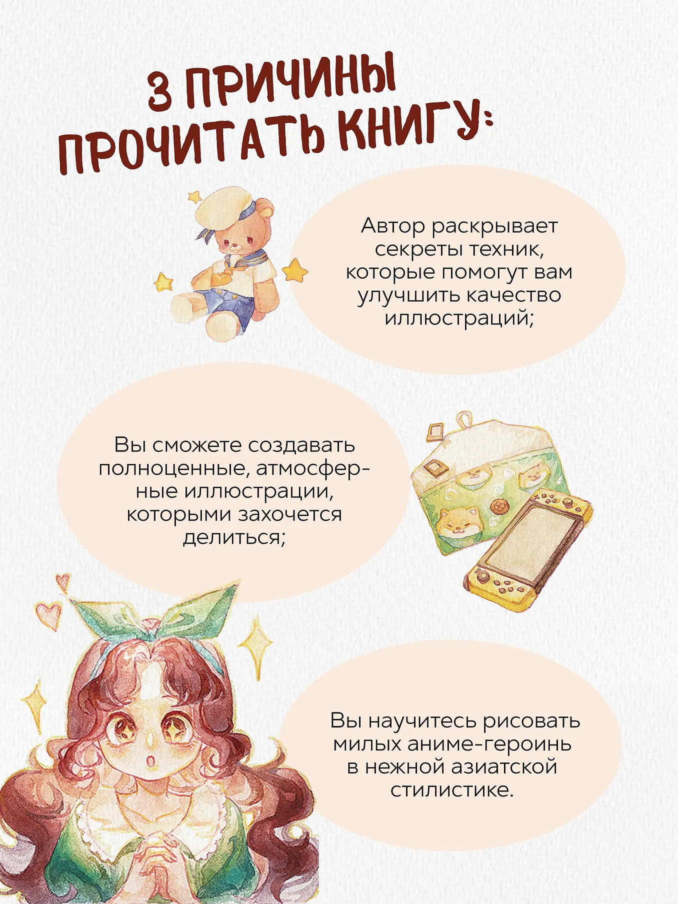 Пошаговые уроки проведут вас от простого к сложному: от рисования милых предметов — пончиков, сумочек, игрушек — до изображения изящных девушек и создания полноценных иллюстраций с продуманной композицией, выстроенной перспективой и проработанным окружением. А подробные объяснения помогут разобраться во всех основах акварельной живописи — в создании палитры, техниках наложения и смешения цветов и работе со светом.