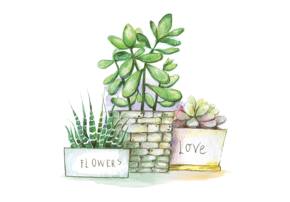 Акварельный скетч Суккуленты в горшках