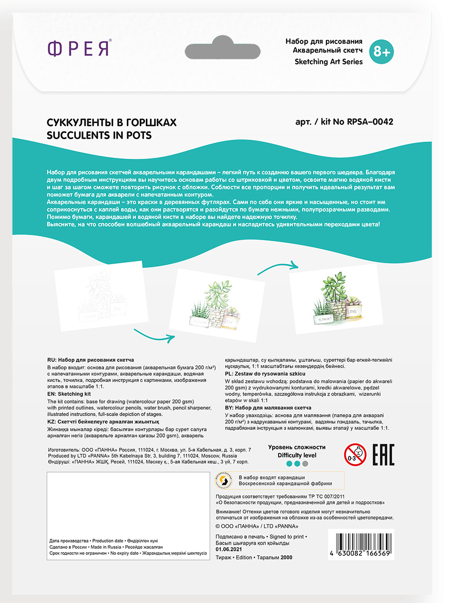В набор входит: основа для рисования с напечатанными контурами, акварельные карандаши, водяная кисть, точилка, подробная инструкция с картинками, изображения этапов в масштабе 1:1