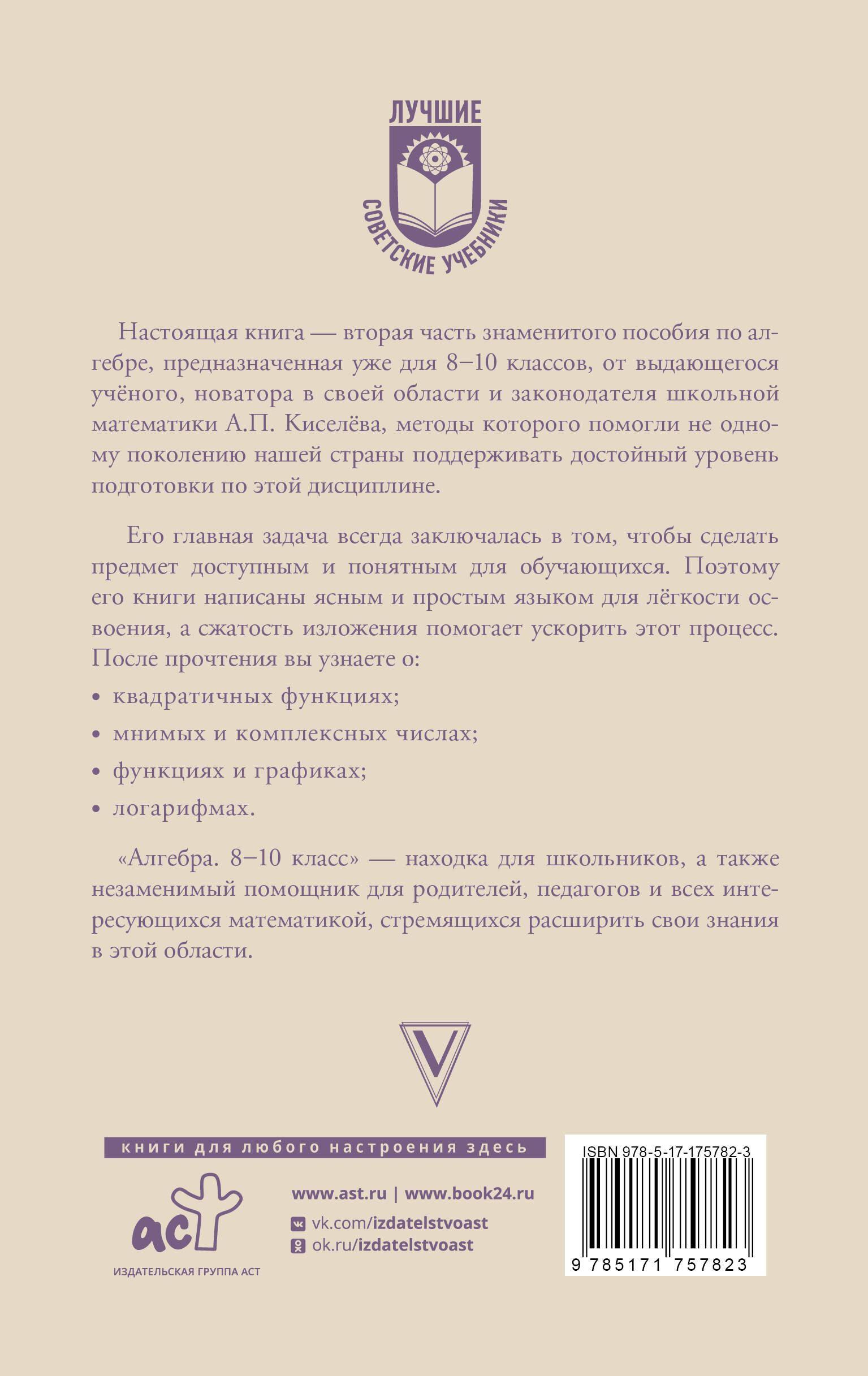 Настоящая книга – вторая часть знаменитого пособия по алгебре, предназначенная уже для 8-10 классов, от выдающегося учёного, новатора своей области и законодателя школьной математики А.П. Киселёва, методы которого помогли не одному поколению нашей страны поддерживать достойный уровень подготовки по этой дисциплине.