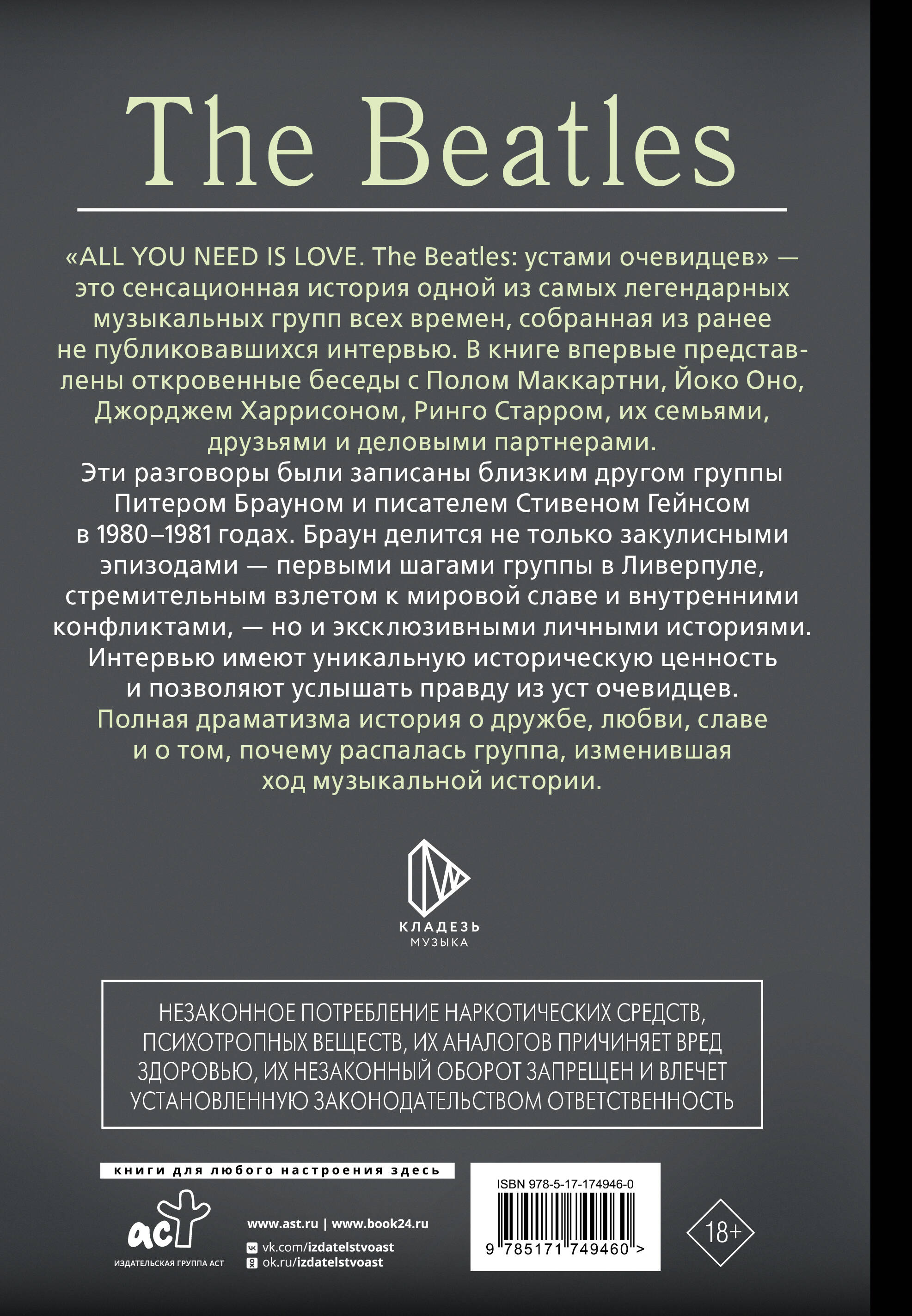 "ALL YOU NEED IS LOVE. The Beatles: устами очевидцев" — это сенсационная история одной из самых легендарных музыкальных групп всех времен, собранная из ранее не публиковавшихся интервью. В книге впервые представлены откровенные беседы с Полом Маккартни, Йоко Оно, Джорджем Харрисоном, Ринго Старром, их семьями, друзьями и деловыми партнерами.