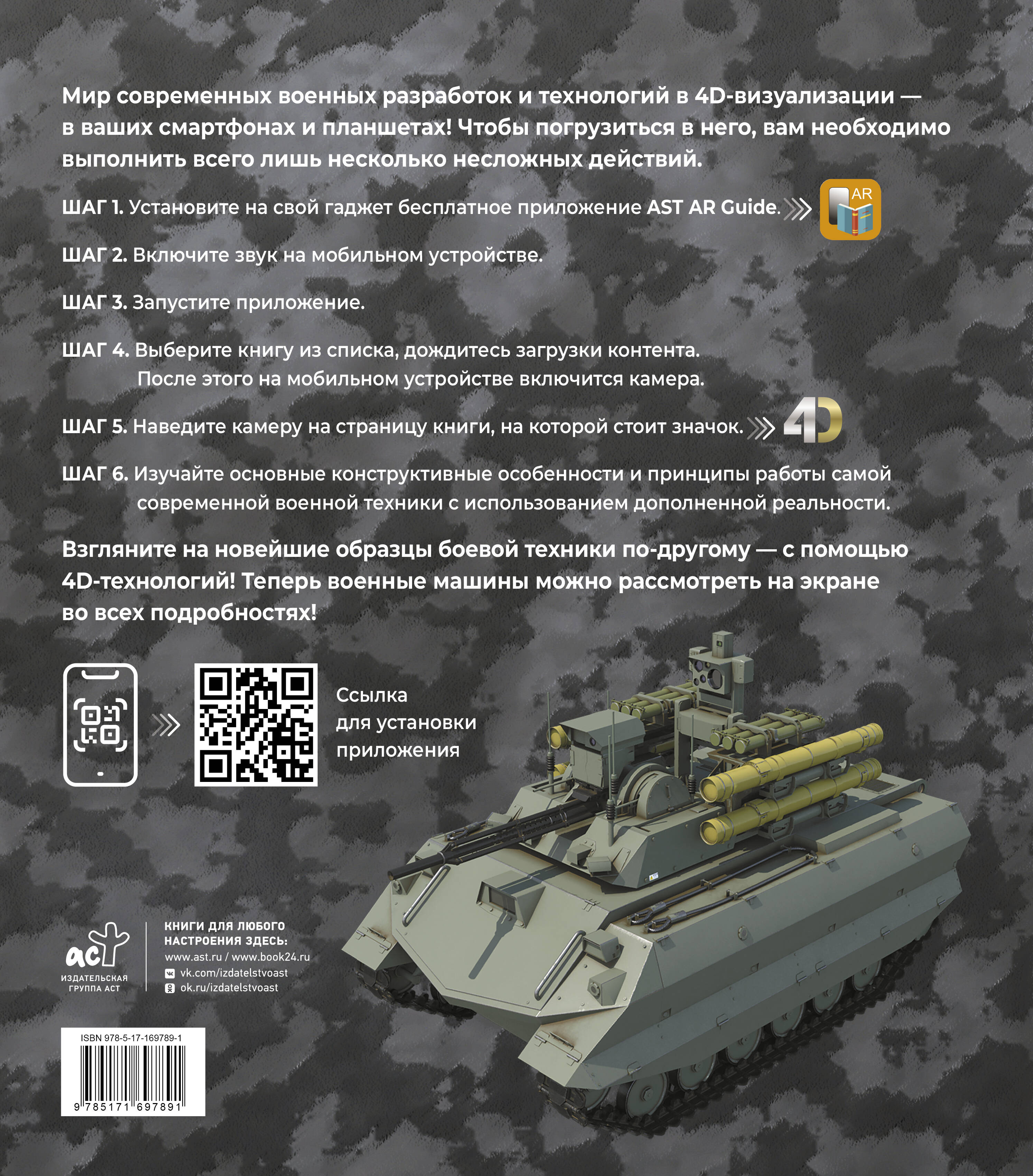 Эта книга призвана погрузить читателя в увлекательный мир новейших военных технологий с использованием дополненной реальности, которая позволяет не просто увидеть изображения образцов боевой техники, но и "оживить" их с помощью смартфона или планшета. Все, кого интересуют инновации в сфере вооружений, смогут расширить свои познания о наземных боевых роботах и беспилотных летательных аппаратах, ракетных комплексах, бронетехнике, авиации и флоте и по-новому взглянуть на развитие военной промышленности в целом. Ведь технологическое развитие цивилизации не стоит на месте, а с каждым днем нарастает в геометрической прогрессии, и ни для кого не секрет, что в первую очередь новинки внедряются в военно-промышленном комплексе. Визуализация с помощью 4D-технологий позволит лучше понять устройство и принципы работы современных боевых систем, а также оценить их вклад в обороноспособность разных стран. Сочетание информативности, новаторства и увлекательной подачи материала делает это издание по-настоящему ценным для всех поклонников военной техники и современных технологий.