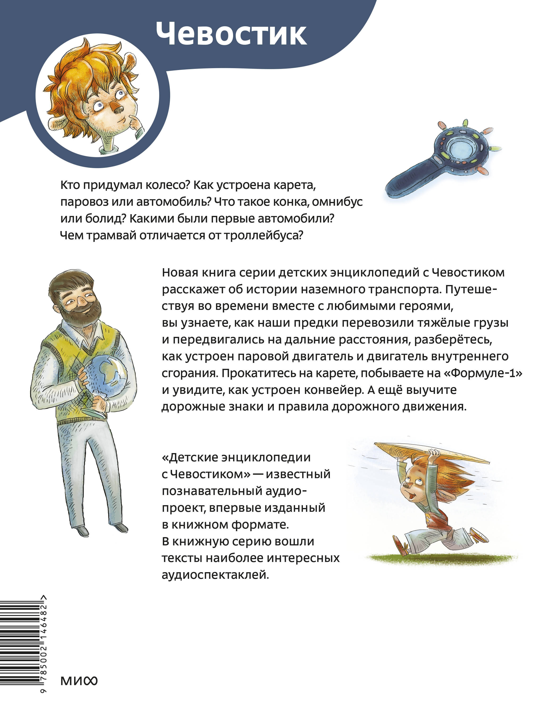 Новая книга из серии детских энциклопедий с Чевостиком расскажет об истории наземного транспорта. Путешествуя во времени вместе с любимыми героями, ребенок узнает, как наши предки перевозили тяжёлые грузы и передвигались на дальние расстояния, разберётся, как устроен паровой двигатель и двигатель внутреннего сгорания. Прокатится на карете, побывает на "Формуле-1" и увидит, как устроен конвейер. А еще выучит дорожные знаки и правила дорожного движения.