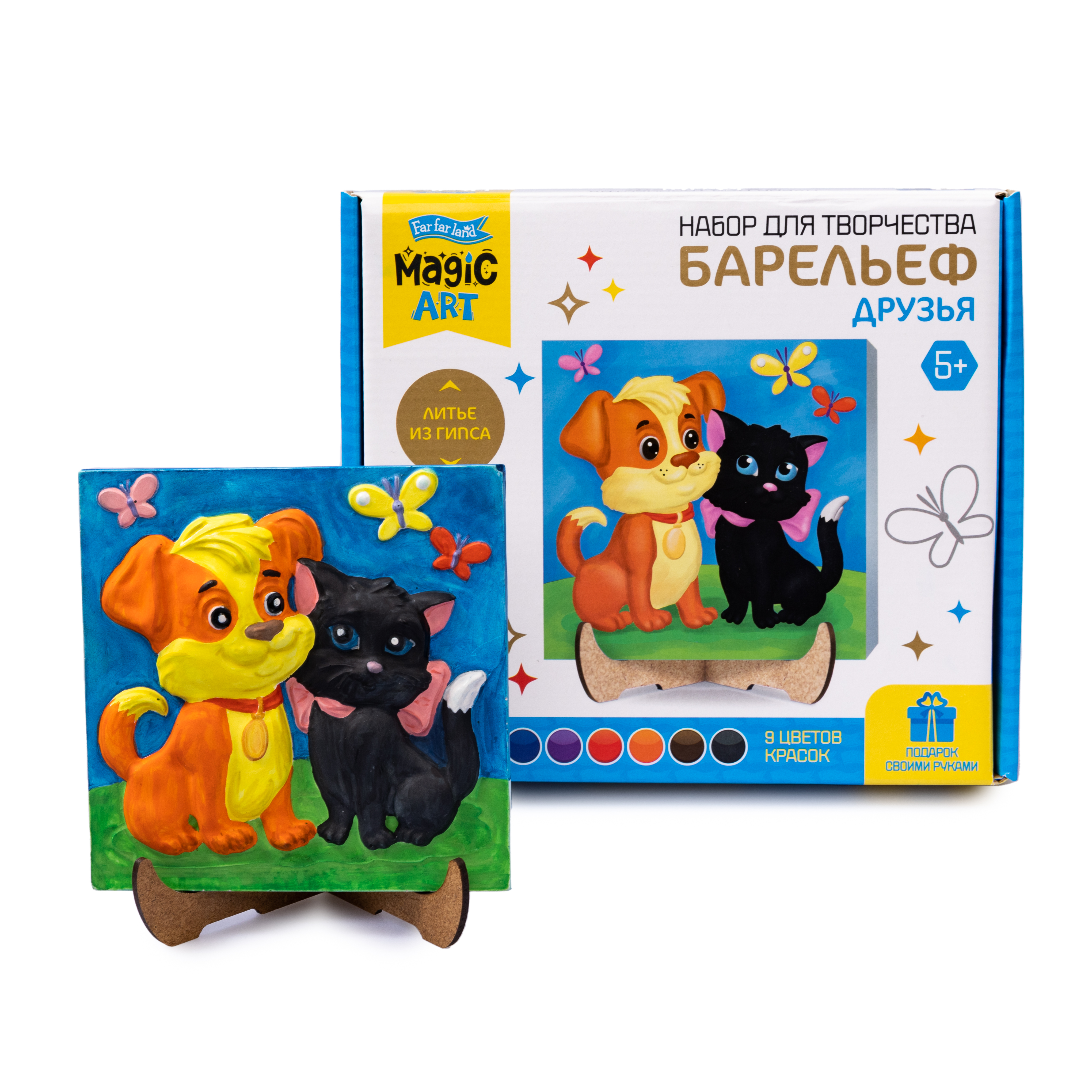 гипс – 1 пакет (200 грамм), форма для отливки – 1 шт., акварельные краски – 9 цветов, кисточка – 1 шт., подставка для готового барельефа, инструкция.