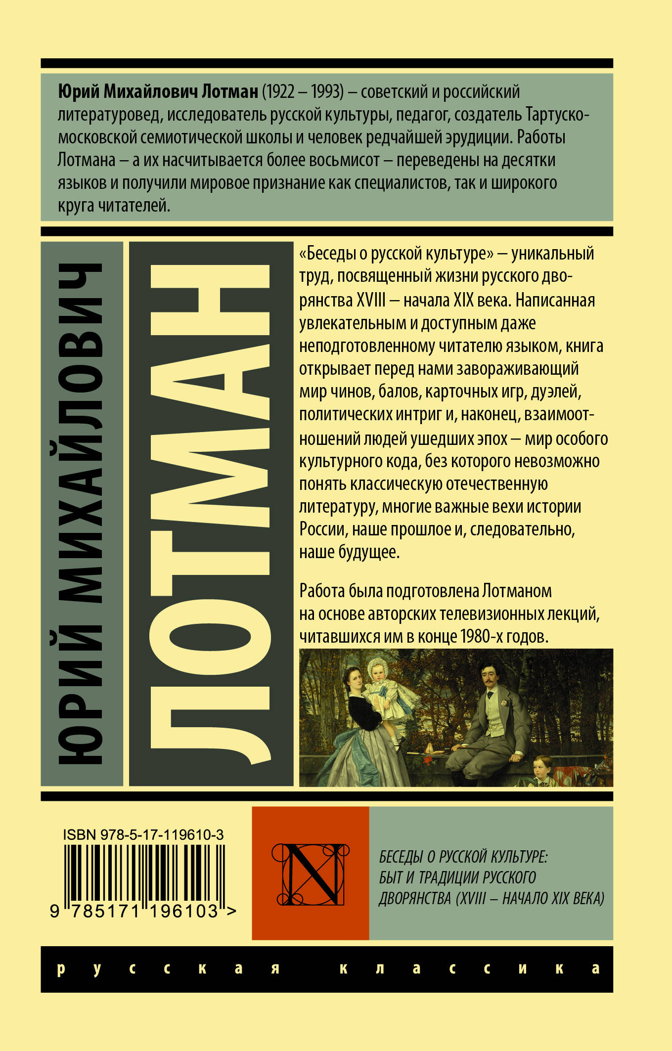 "Беседы о русской культуре" — уникальный труд, посвященный жизни русского дворянства XVIII — начала XIX века. Написанная увлекательным и доступным даже неподготовленному читателю языком, книга открывает перед нами завораживающий мир чинов, балов, карточных игр, дуэлей, политических интриг и, наконец, взаимоотношений людей ушедших эпох — мир особого культурного кода, без которого невозможно понять классическую отечественную литературу, многие важные вехи истории России, наше прошлое и, следовательно, наше будущее.