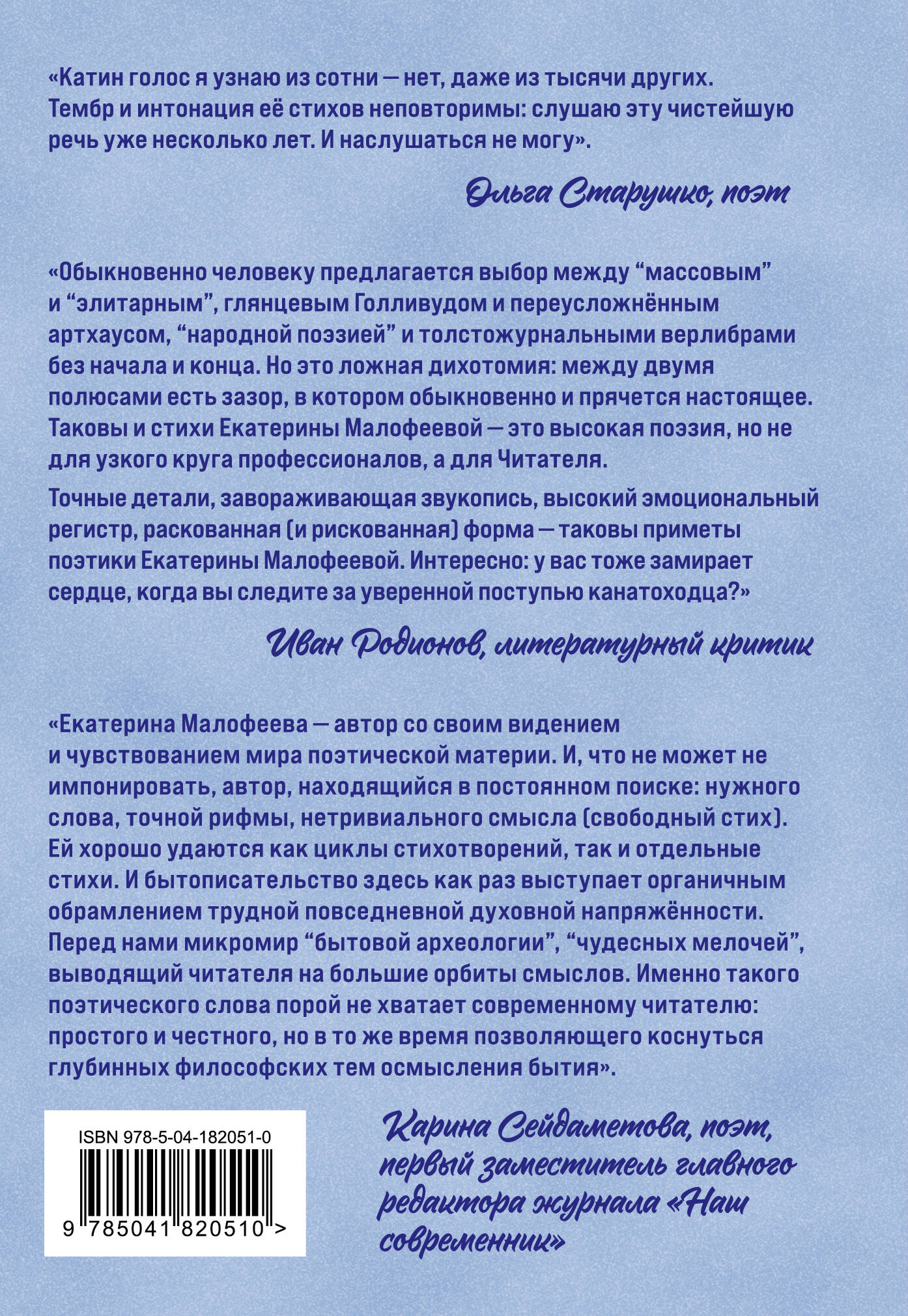 «Точные детали, завораживающая звукопись, высокий эмоциональный регистр, раскованная (и рискованная) форма — таковы приметы поэтики Екатерины Малофеевой», — пишет критик Иван Родионов. И действительно: сборник «Бездомные звёзды» открывает читателю удивительные созвездия, созданные поэтессой: современные, самобытные и завораживающие, способные подсказать читателю дорогу к новым поэтическим мирам. Это настоящая современная поэзия, чутко улавливающая настроения и надежды наших дней, способная врачевать душевные раны и, как путеводная звезда, направлять читателя, плутающего в лабиринте противоречивых чувств.