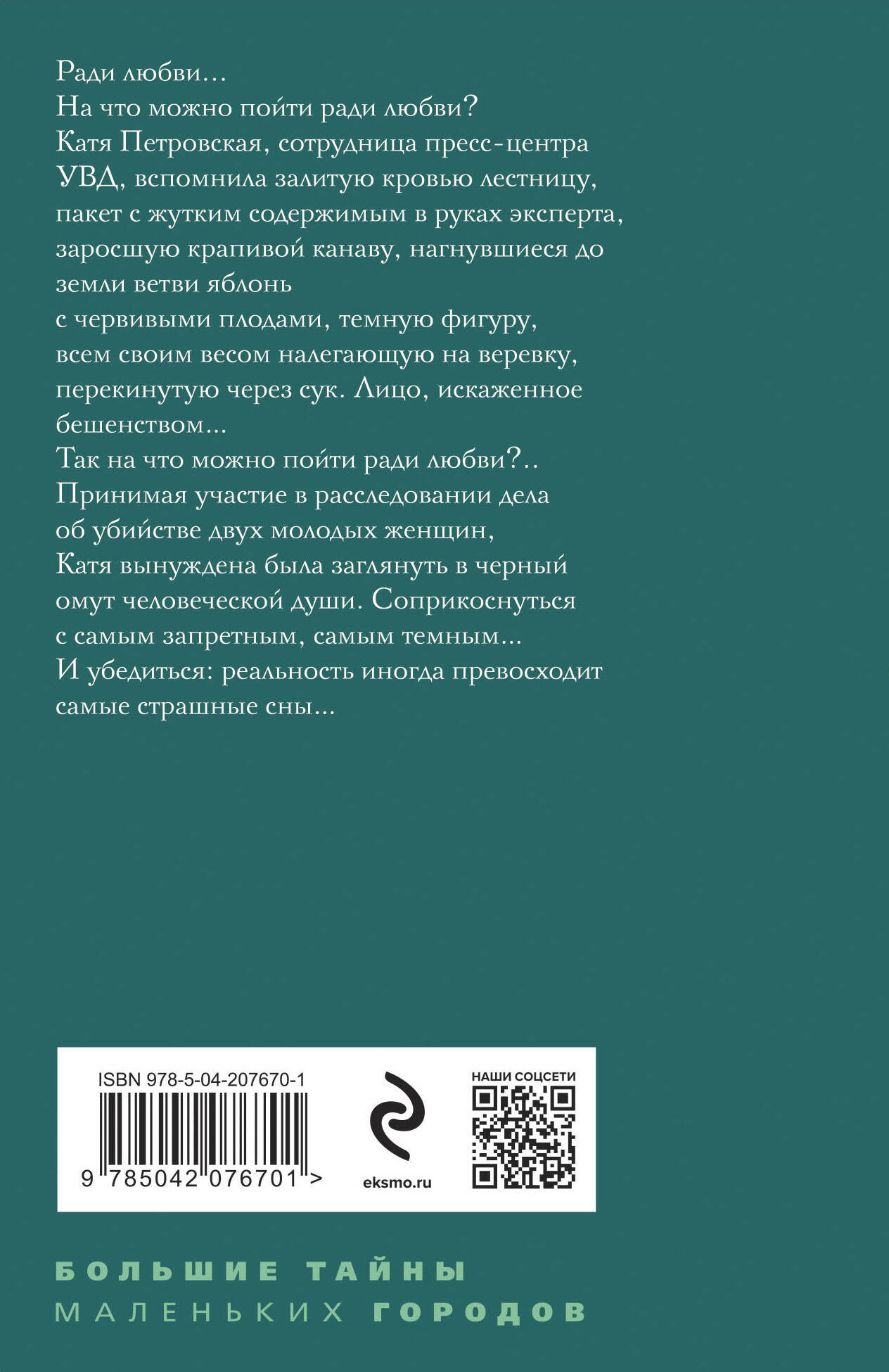 Ради любви... На что можно пойти ради любви? Катя Петровская, сотрудница Пресс-центра УВД, вспомнила залитую кровью лестницу, пакет с его жутким содержимым в руках эксперта, заросшую крапивой канаву, нагнувшиеся до земли ветви яблонь с червивыми плодами, темную фигуру, всем своим весом налегающую на веревку, перекинутую через сук. Лицо, искаженное бешенством… Так, на что можно пойти ради любви?.. Принимая участие в расследовании дела об убийстве двух молодых женщин, Кате пришлось заглянуть в черный омут человеческой души. Соприкоснуться с самым запретным, самым темным… И убедиться — реальность иногда превосходит самые страшные сны…