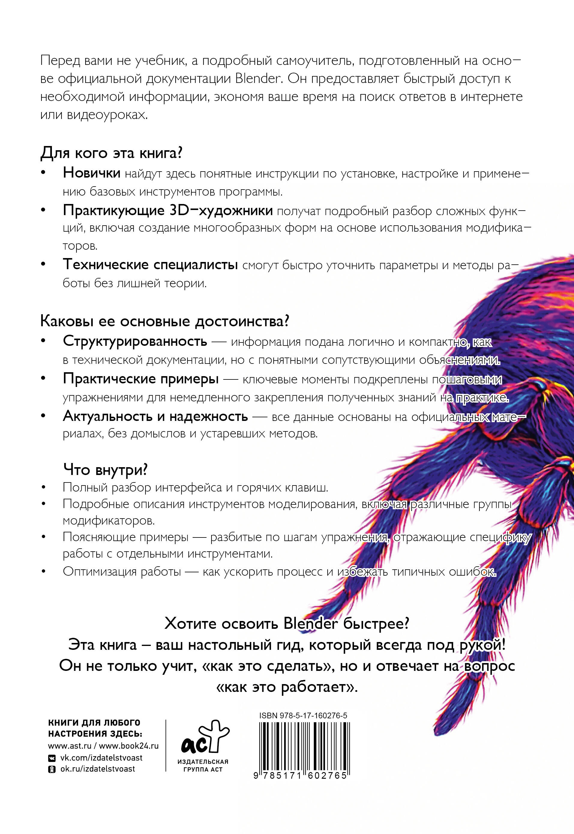 Полезной эту книгу найдут и те, кто уже знаком с основами Blender и ищет детализированную справочную информацию (художники и технические специалисты, которым требуется оперативно уточнить параметры или методы работы), и те, кто только знакомится с этой программой, поскольку здесь тщательно расписан как процесс ее установки, так и рабочий интерфейс.
