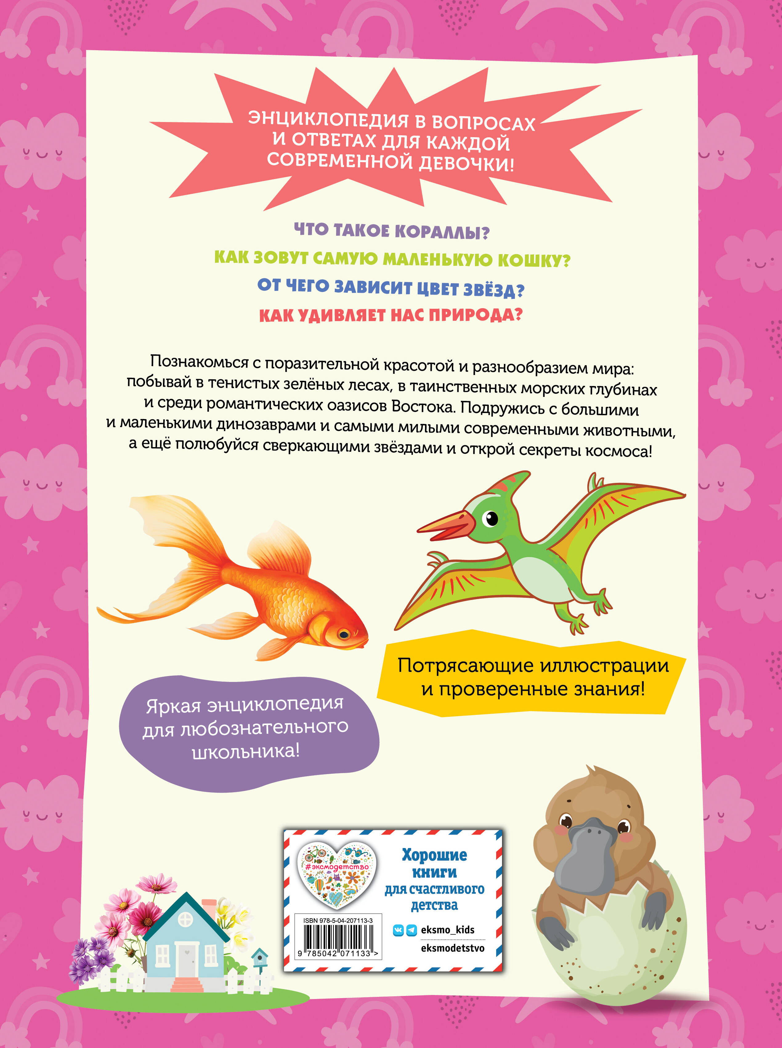 Полезен ли ландыш? Где живёт розовый дельфин? Какие облака на Венере? Правда ли, что у животных есть семьи? Кто из зверей питается только бамбуком? С этой энциклопедией ты познакомишься с окружающим миром: совершишь путешествие по горам, пустыням и океанам нашей планеты, подружишься с различными животными, побываешь в гостях у динозавров и полюбуешься далёкими звёздами и планетами!