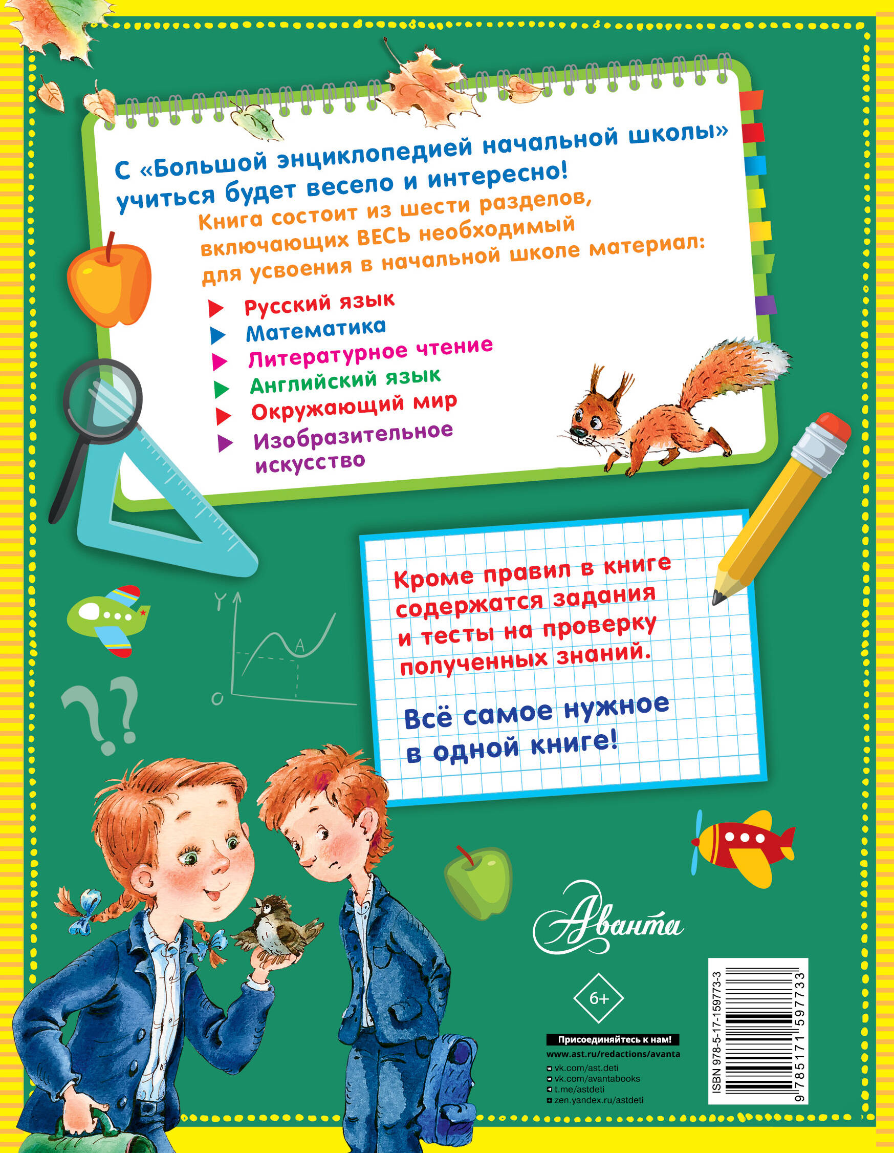 В этой книге шесть разделов, каждый из которых посвящен предмету, который ваш ребёнок будет изучать в начальной школе. Русский язык и литературное чтение, английский и окружающий мир, изобразительное искусство и математика. Часто родители, пытаясь помочь своему первоклашке, попадают впросак, объясняя какие-то правила или упражнения. А малыш гордо заявляет, что учительница объясняет совсем не так. Наша энциклопедия поможет ребёнку понять не усвоенный в школе или дома во время болезни материал, и родителям покажет, как его дают детям на уроке. Тесты и задания дадут представление насколько ваш ребёнок усвоил теорию, проверить полученные знания, а весёлые иллюстрации поддержат положительный настрой на учёбу.