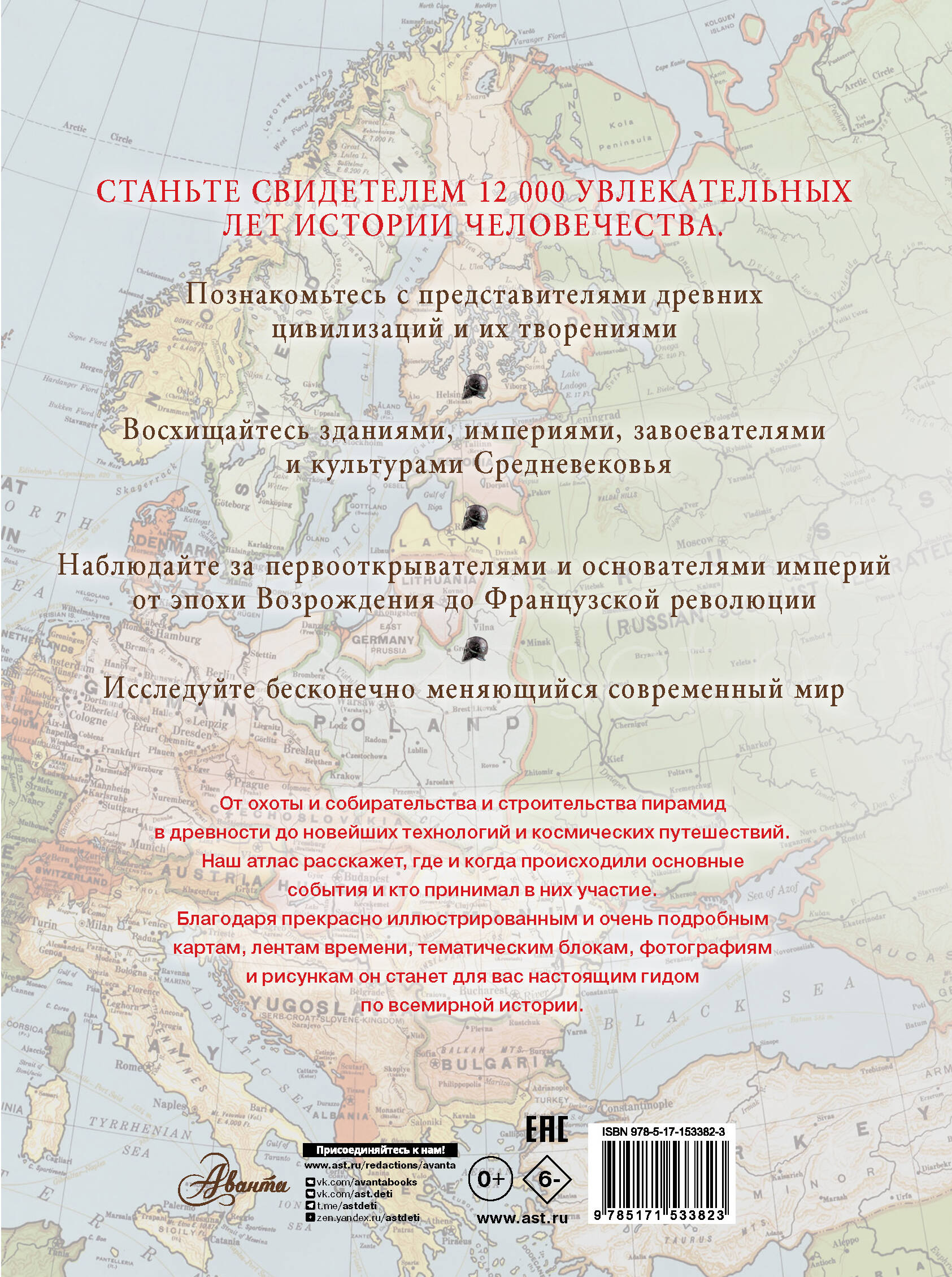 От охоты и собирательства и строительства пирамид в древности до новейших технологий и космических путешествий. Наш атлас расскажет, где и когда происходили основные события и кто принимал в них участие. Благодаря прекрасно иллюстрированным и очень подробным картам, лентам времени, тематическим блокам, фотографиям и рисункам он станет для вас настоящим гидом по всемирной истории.
