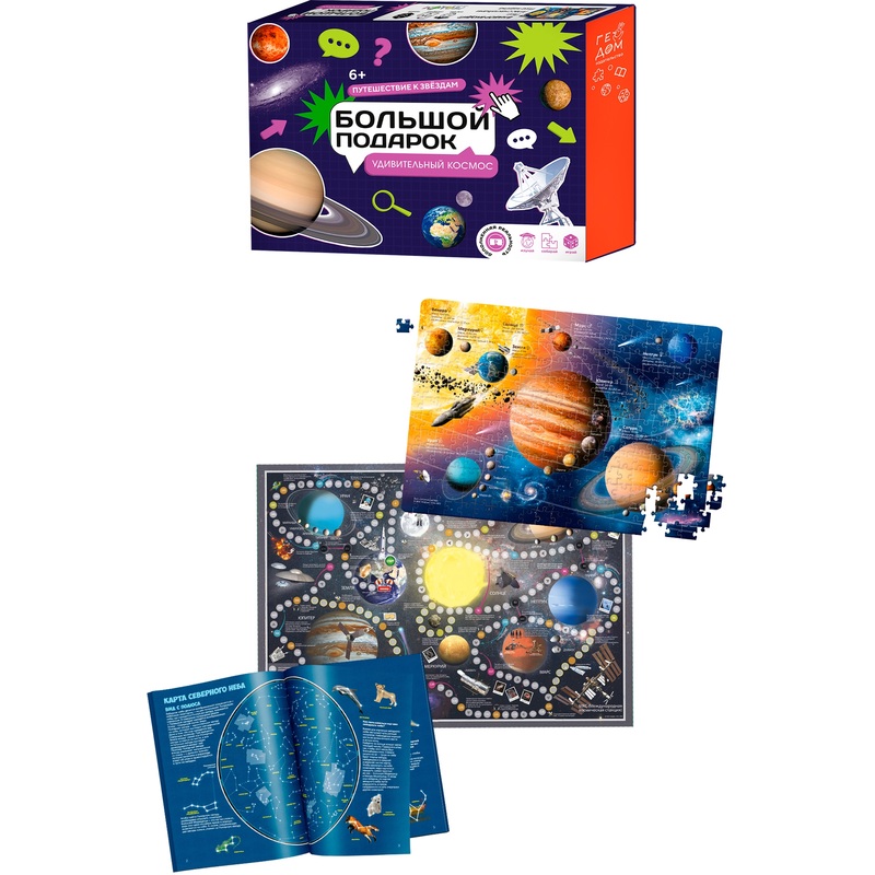 В большом наборе: Карта-пазл. Солнечная система. Формат 33*47. 260 деталей. Атлас с наклейками. Звездное небо. Формат 21*29,7. 45 наклеек. Игра-ходилка с фишками. Солнечная система. Подарок поможет расширить знания о вселенной и космосе. С картой-пазлом "Солнечная система" из 260 деталей можно изучить строение Солнечной системы, названия планет и их спутников. Атлас с наклейками "Звёздное небо" расширяет границы представлений о космосе, знакомит с картами звёздного неба и созвездиями, которые наблюдают в разное время года. В атласе даны легенды, связанные с названиями созвездий, рассказывается о способах наблюдения космоса. Игра развлечет детей в возрасте 6+