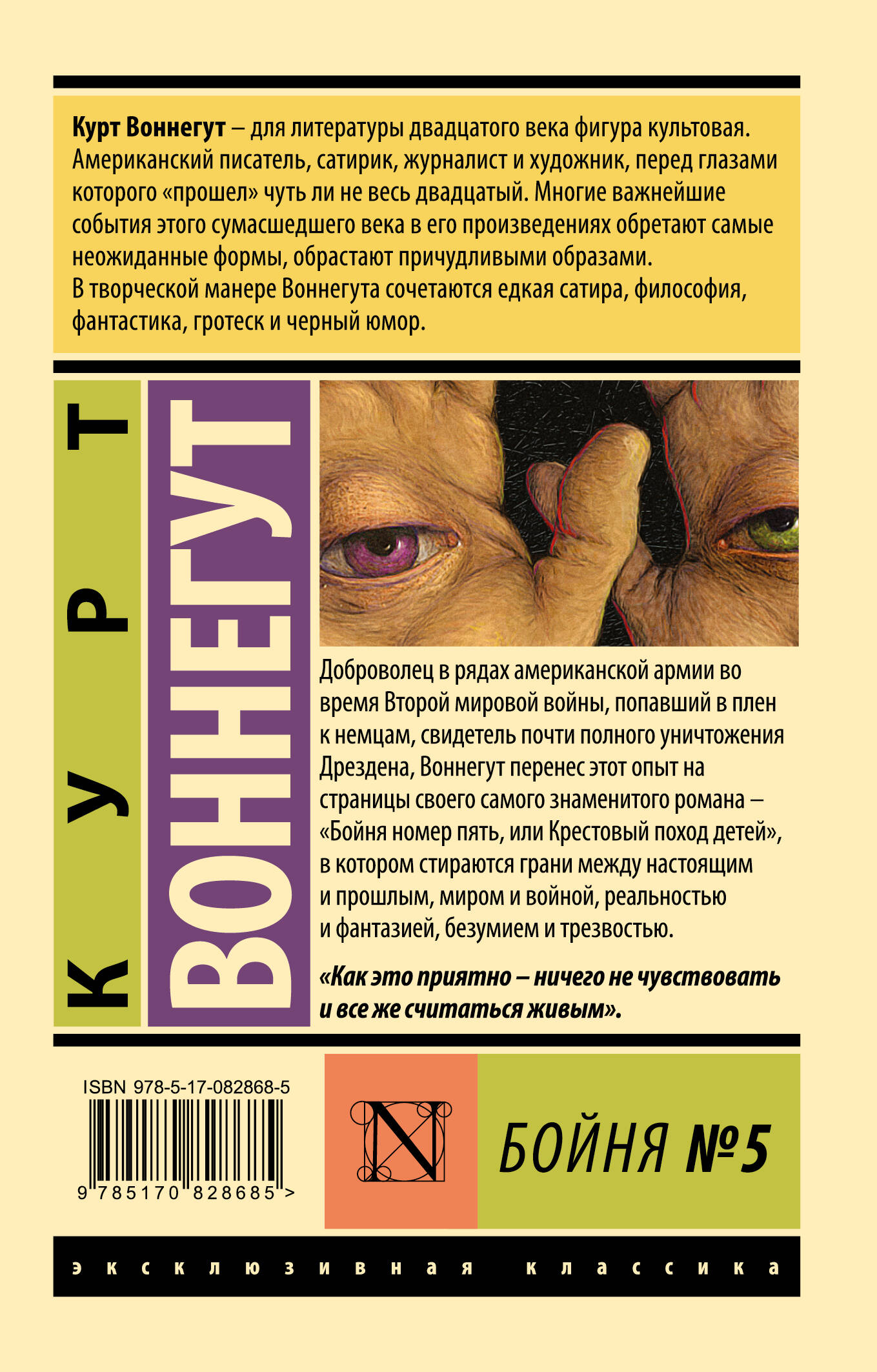 Доброволец в рядах американской армии во время Второй мировой войны, попавший в плен к немцам, свидетель почти полного уничтожения Дрездена, Воннегут перенес этот опыт на страницы своего самого знаменитого романа – "Бойня номер пять, или Крестовый поход детей", в котором стираются грани между настоящим и прошлым, миром и войной, реальностью и фантазией, безумием и трезвостью.
