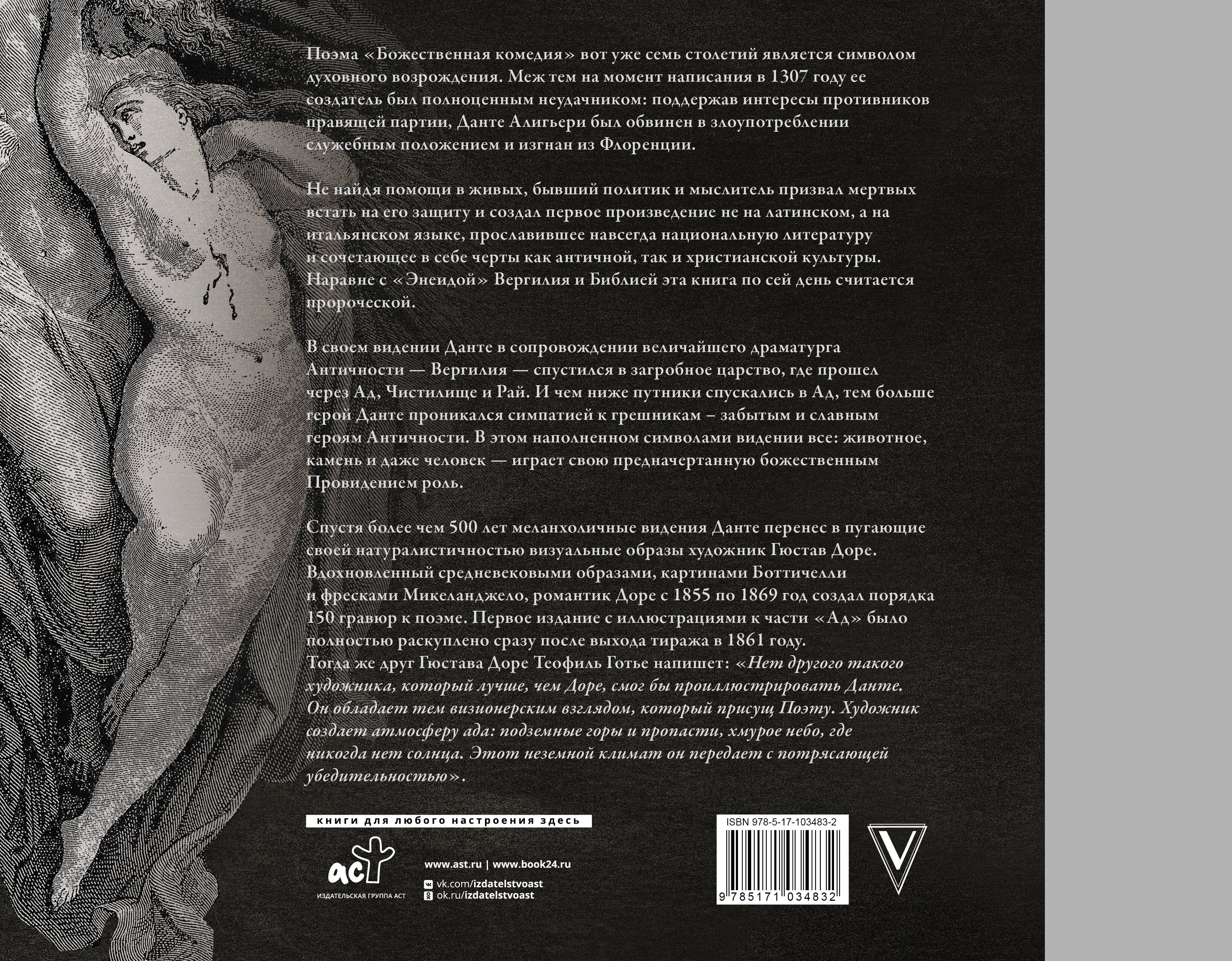 Спустя более чем 500 лет меланхоличные видения Данте перенес в пугающие своей натуралистичностью визуальные образы художник Гюстав Доре. Вдохновленный средневековыми образами, картинами Боттичелли и фресками Микеланджело, романтик Доре с 1855 по 1869 год создал порядка 150 гравюр к поэме. Первое издание с иллюстрациями к части "Ад" было полностью раскуплено сразу после выхода тиража в 1861 году. Тогда же друг Гюстава Доре Теофиль Готье напишет: "Нет другого такого художника, который лучше, чем Доре, смог бы проиллюстрировать Данте. Он обладает тем визионерским взглядом, который присущ Поэту. Художник создает атмосферу ада: подземные горы и пропасти, хмурое небо, где никогда нет солнца. Этот неземной климат он передает с потрясающей убедительностью".