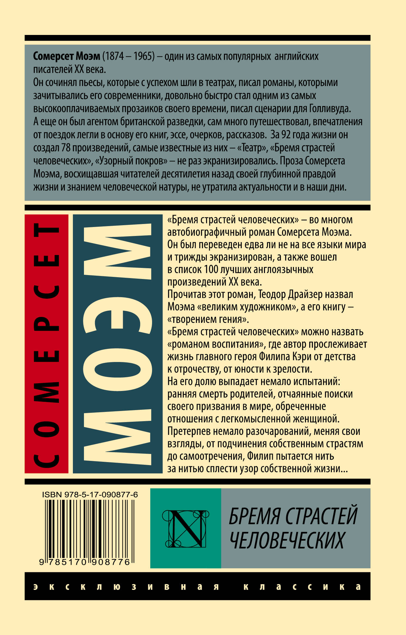 "Бремя страстей человеческих" — во многом автобиографичный роман Сомерсета Моэма. Он был переведен едва ли не на все языки мира и трижды экранизирован, а также вошел в список 100 лучших англоязычных произведений XX века. Прочитав этот роман, Теодор Драйзер назвал Моэма "великим художником", а его книгу — "творением гения".