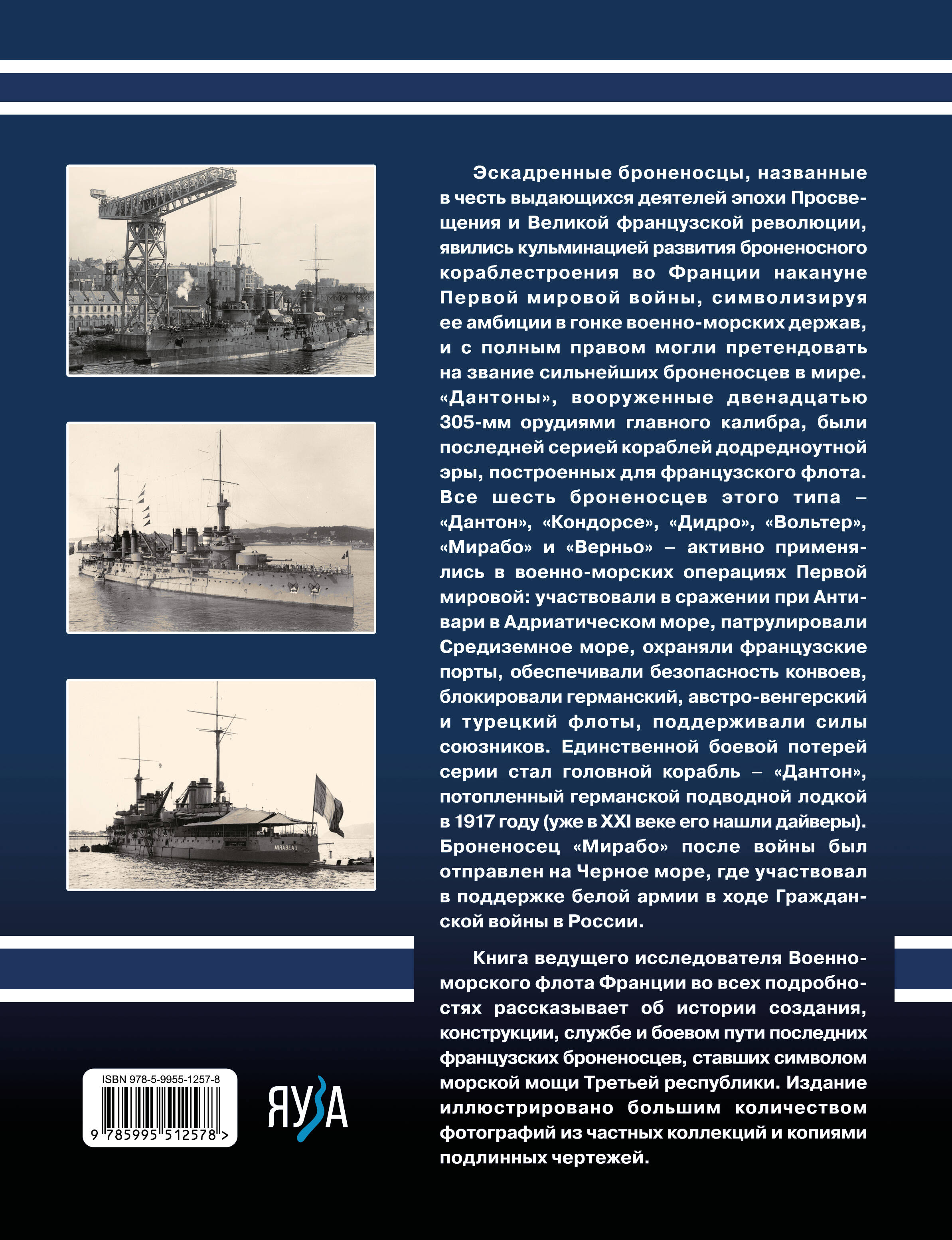 Эскадренные броненосцы, названные в честь выдающихся деятелей эпохи Просвещения и Великой Французской революции, явились кульминацией развития кораблестроения во Франции накануне Первой Мировой войны, символизируя ее амбиции в гонке военно-морских держав и с полным правом могли претендовать на звание сильнейших в мире. Броненосцы типа "Дантон", вооруженные двенадцатью 305-мм орудиями главного калибра, были последней серией кораблей додредноутной эры, построенных для французского флота. Все шесть броненосцев, "Дантон", "Кондорсе", "Дидро", "Вольтер", "Мирабо" и "Верньо", активно применялись в военно-морских операциях Первой Мировой: участвовали в сражении при Антивари в Адриатическом море, патрулировали Средиземное море, охраняли французские порты, обеспечивали безопасность конвоев, блокировали германский, австро-венгерский и турецкий флоты, поддерживали силы союзников. Единственной боевой потерей серии стал головной корабль – "Дантон", потопленный германской подводной лодкой в 1917 году (уже в XXI веке на дне его нашли дайверы). Броненосец "Мирабо" после войны был отправлен на Черное море, где участвовал в поддержке Белой армии во время Гражданской войны в России.