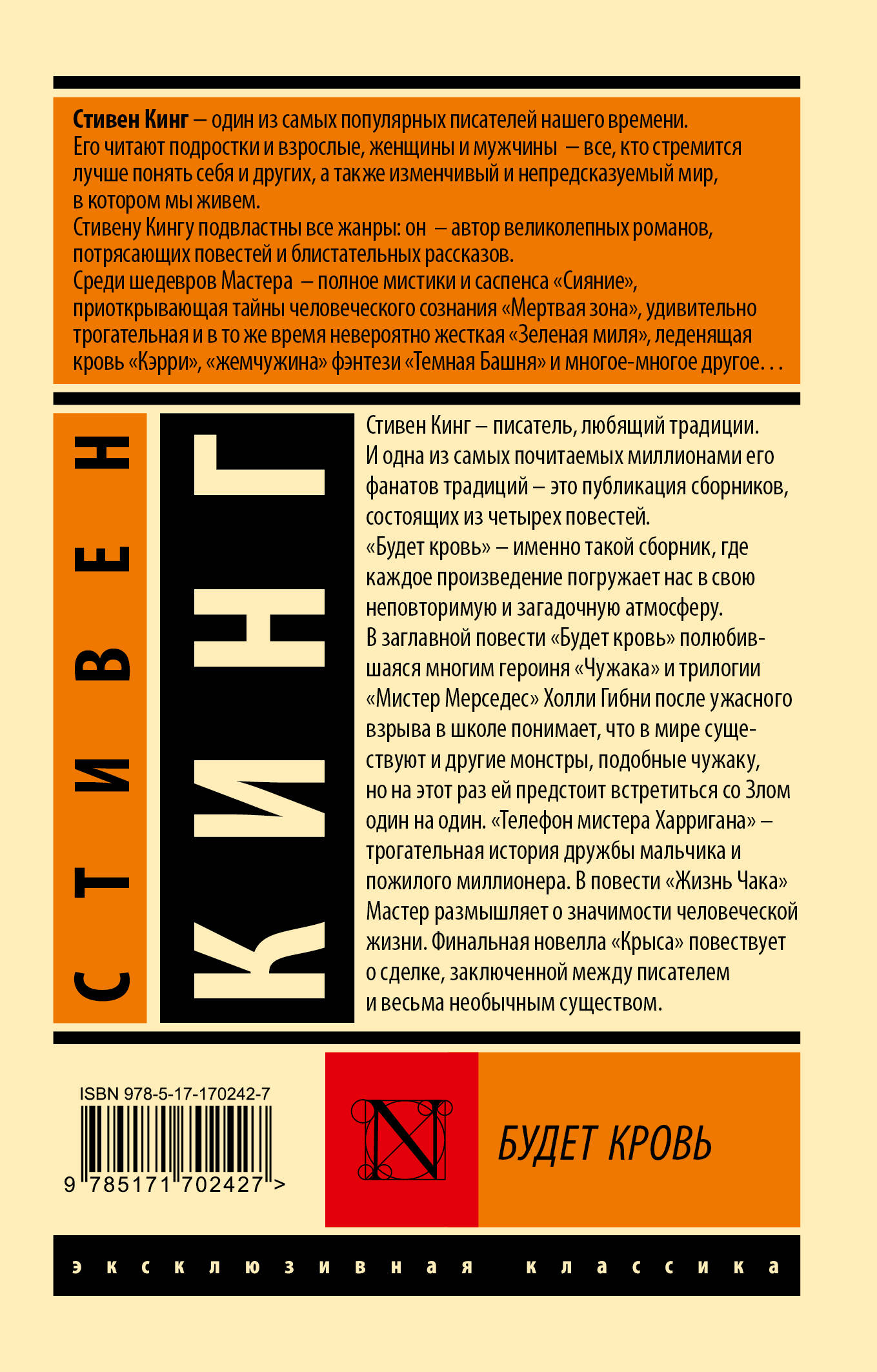 • Четыре произведения под одной обложкой: «Будет кровь», «Телефон мистера Харригана», «Жизнь Чака» и «Крыса».