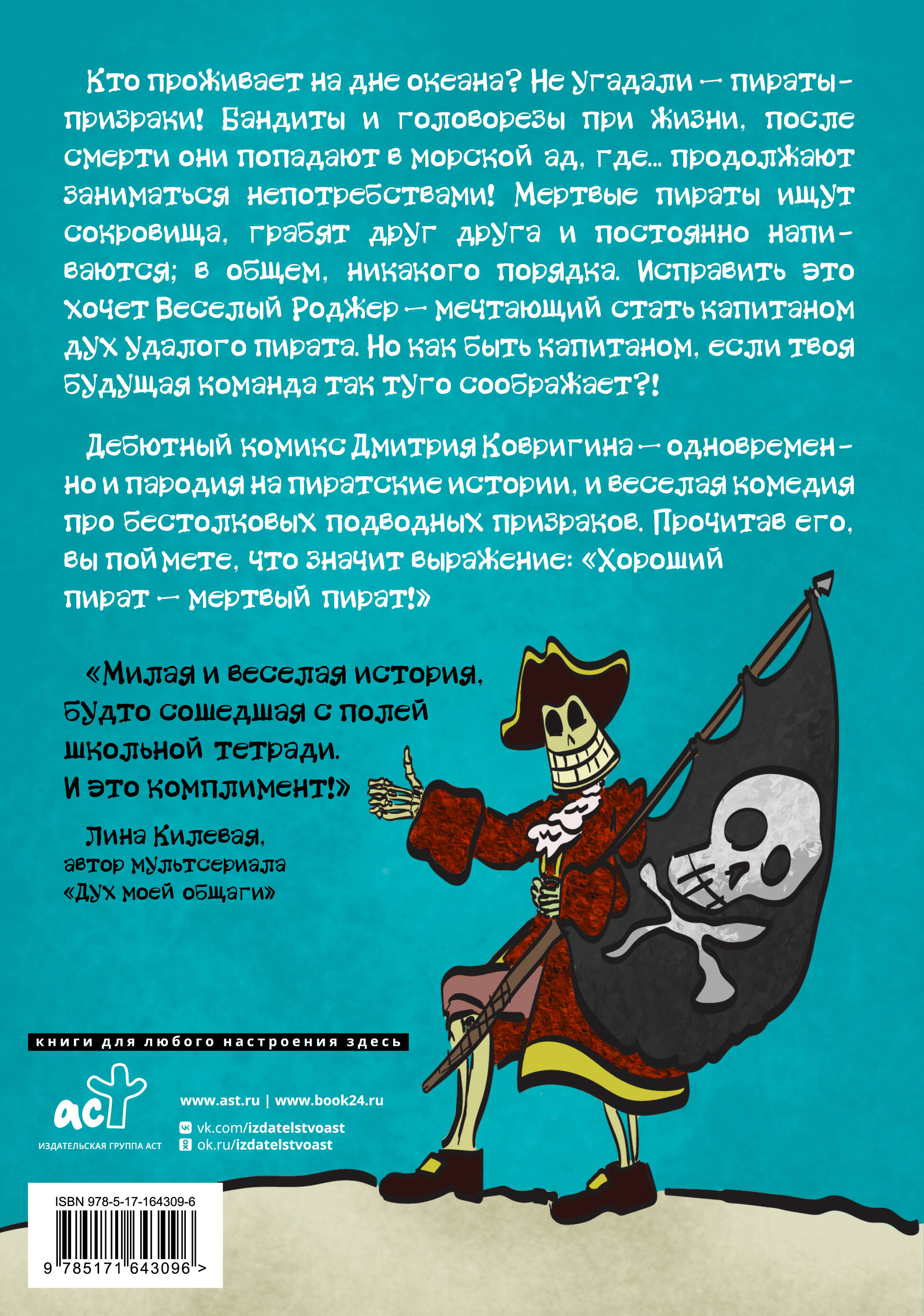 Дебютный комикс Дмитрия Ковригина — одновременно и пародия на пиратские истории, и веселая комедия про бестолковых подводных призраков. Прочитав его, вы поймете, что значит выражение: "Хороший пират — мертвый пират!"