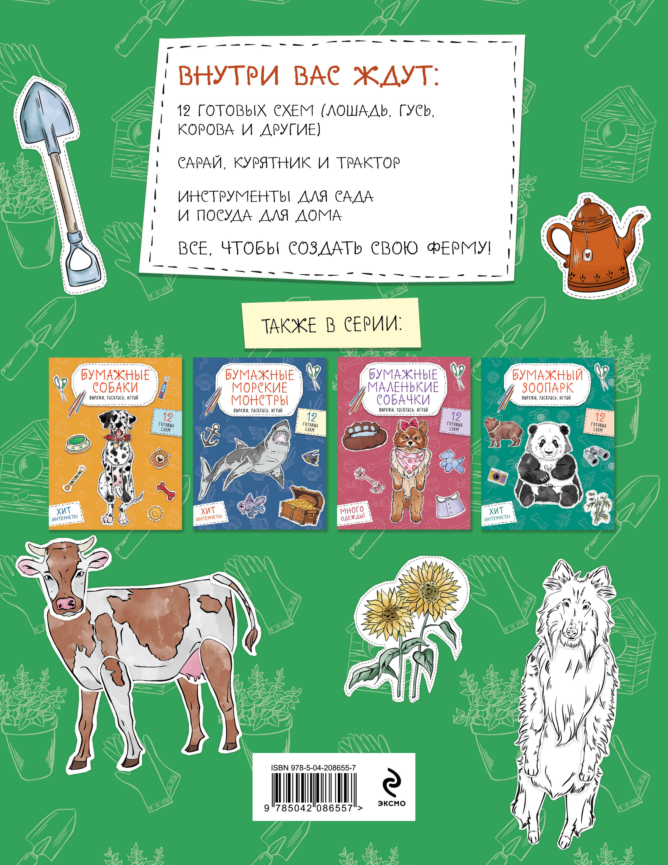 Бумажные животные, покорившие интернет! Сотни тысяч детей и взрослых вырезают, играют и коллекционируют бумажных питомцев. ВПЕРВЫЕ В ПРОДАЖЕ бумажная ферма — только вырезай и играй! Внутри вас ждут: 12 готовых схем ( лошадь, гусь, корова, курица, коза, осел, овца, индюк, кролик, свинка, пастушья собака, мышь полевка), сарай, курятник и трактор, инструменты для сада и посуда для дачного домика. Все, чтобы создать свою ферму!