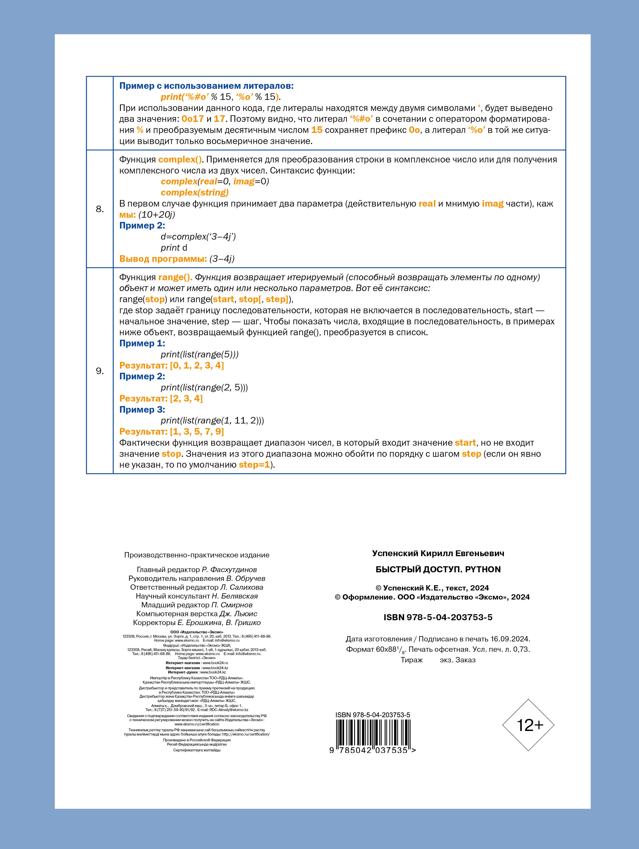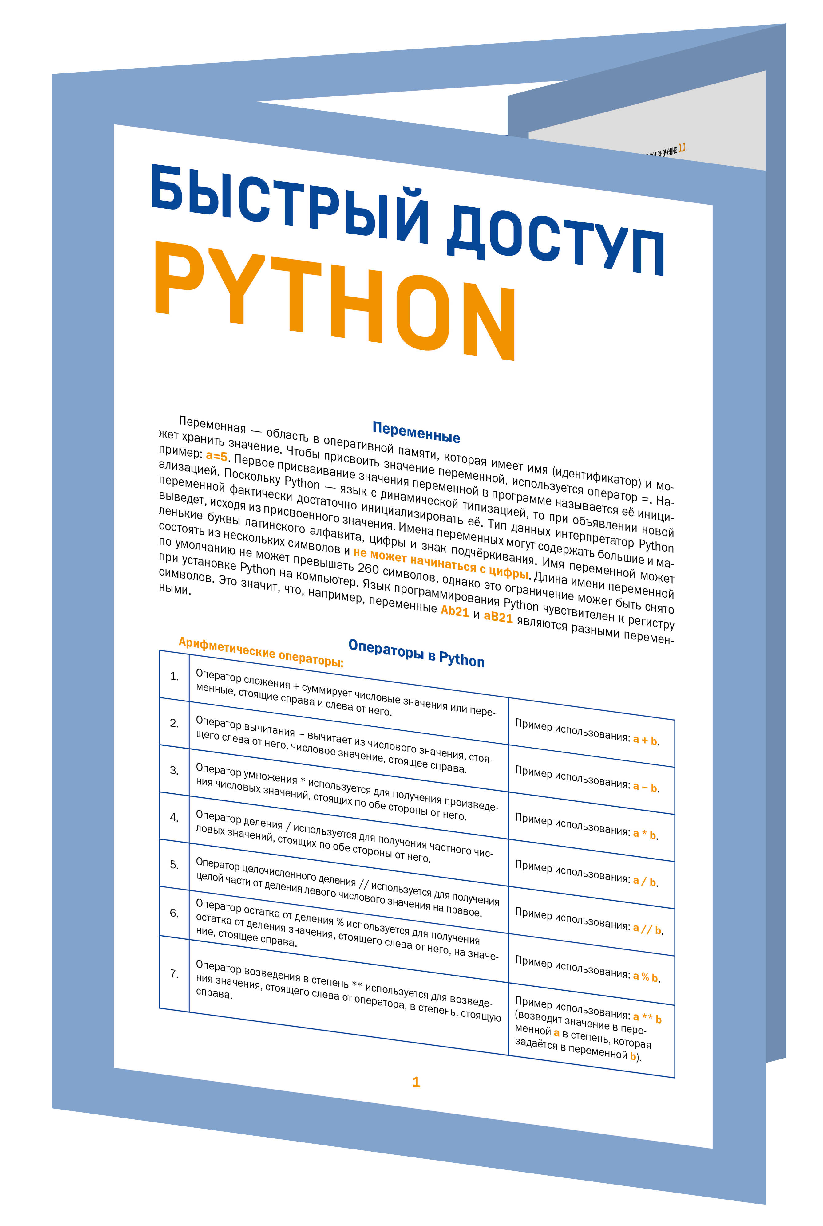 Компактное и удобное руководство для начинающих пользователей. В нем собраны наиболее востребованные переменные, операторы и функции Python, позволяющие быстро и эффективно решать повседневные задачи.