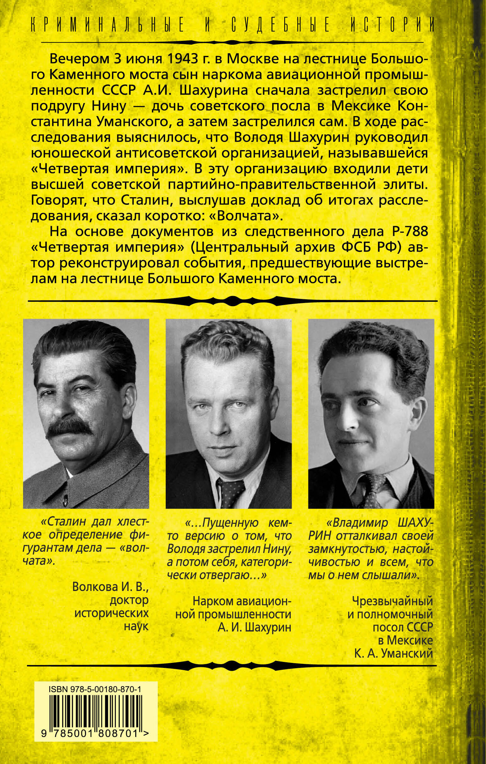 Вечером 3 июня 1943 г. в Москве на лестнице Большого Каменного моста сын наркома авиационной промышленности СССР А.И. Шахурина сначала застрелил свою подругу Нину — дочь советского посла в Мексике Константина Уманского, а затем застрелился сам. В ходе расследования выяснилось, что Володя Шахурин руководил юношеской антисоветской организацией, называвшейся «Четвертая империя». В эту организацию входили дети высшей советской партийно-правительственной элиты. Говорят, что Сталин, выслушав доклад об итогах расследования, сказал коротко: «Волчата».