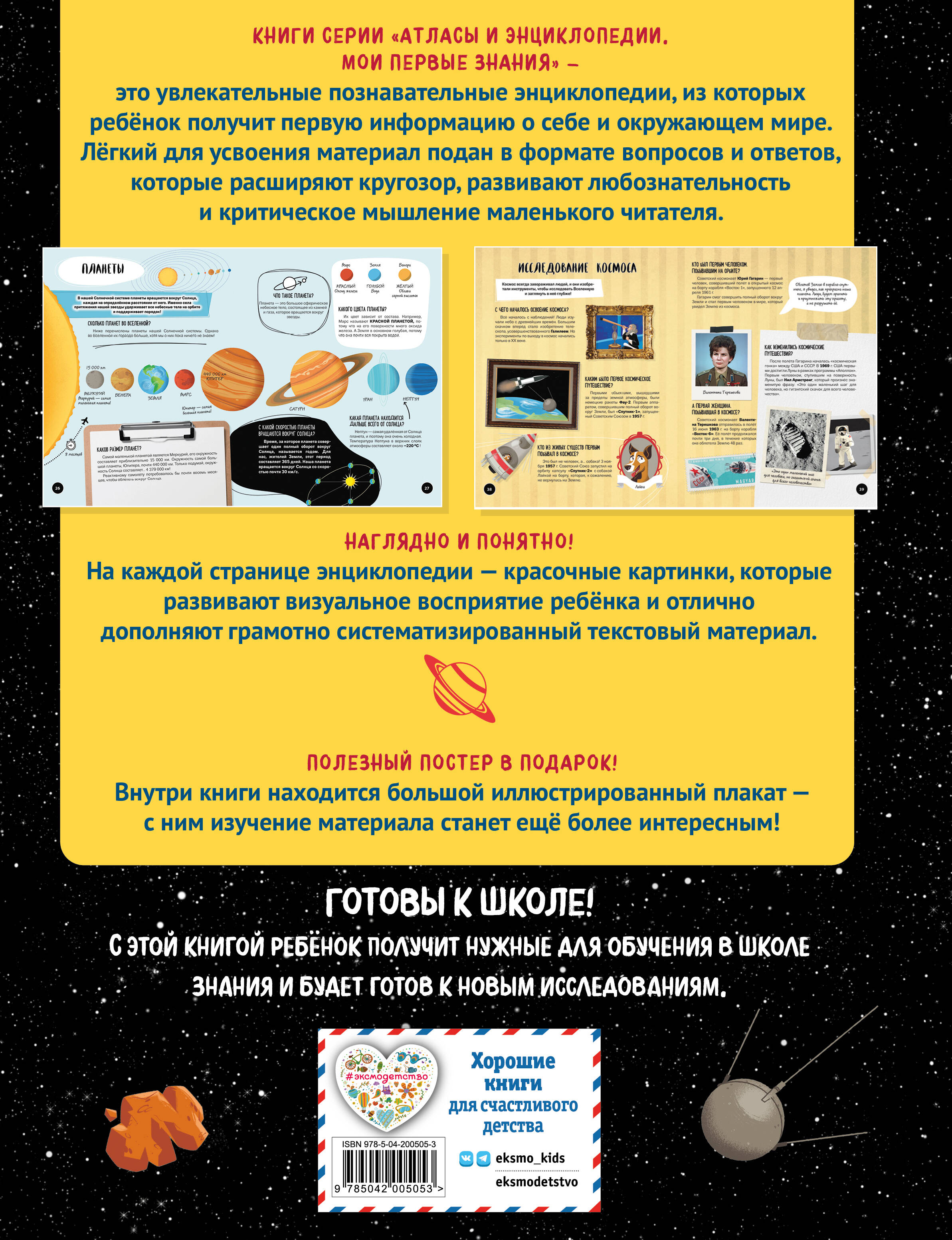 Энциклопедия в формате вопросов и ответов, созданная специально для малышей дошкольного возраста. Вместо длинных статей «научным» языком — наглядные, понятные и увлекательные рассказы о космосе плюс большой постер в подарок. Удивительные галактики и чёрные дыры, тайны звёзд и планет, как стать настоящим космонавтом — всё, что хочется знать маленькому почемучке и о чём он так любит спрашивать! Книга предназначена для совместного семейного досуга и пробуждает интерес ребёнка к самостоятельному чтению.