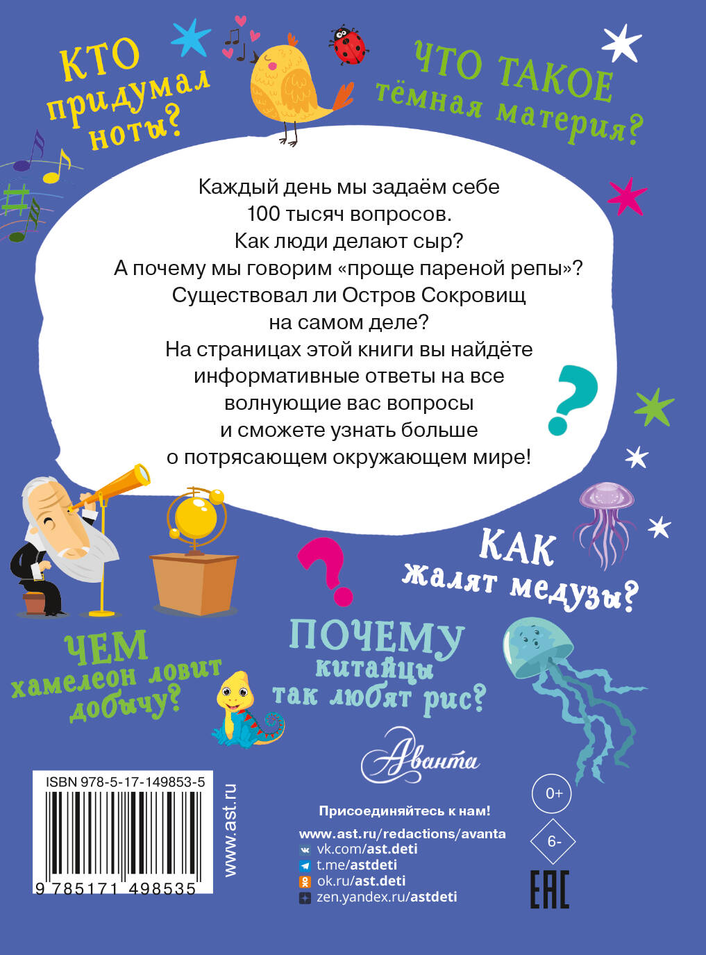 Под обложкой этой маленькой книги собрано великое множество вопросов и ответов на самые разнообразные темы на свете. Почему Японию называют Страной восходящего солнца? Кто придумал эльфов и орков? Почему от бензина на воде появляется радужная плёнка? Сколько всего во Вселенной галактик? Краткие, но очень информативные ответы на эти и другие вопросы помогут вам узнать больше о космосе, географии, истории, физике, биологии. Прочитав эту книгу, вы даже сможете рассказать своим родным и близким, почему днём иногда бывает видно Луну.