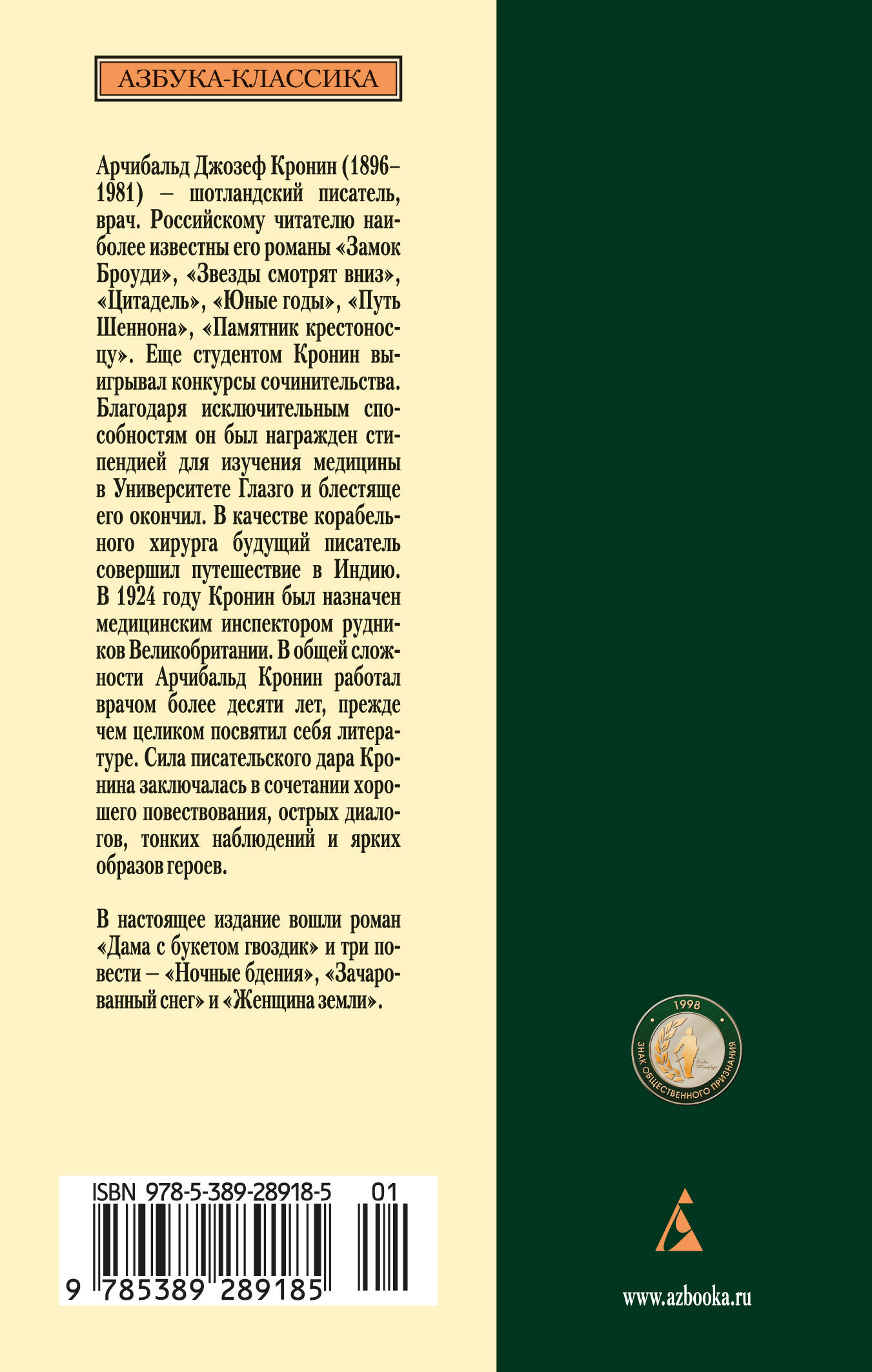 Четыре произведения знаменитого шотландского писателя Арчибальда Кронина под одной обложкой! В сборник вошли роман «Дама с букетом гвоздик», а также три повести — «Ночные бдения», «Зачарованный снег» и «Женщина земли». Лучшие традиции классической британской прозы от, пожалуй, самого успешного романиста 1930-х годов.