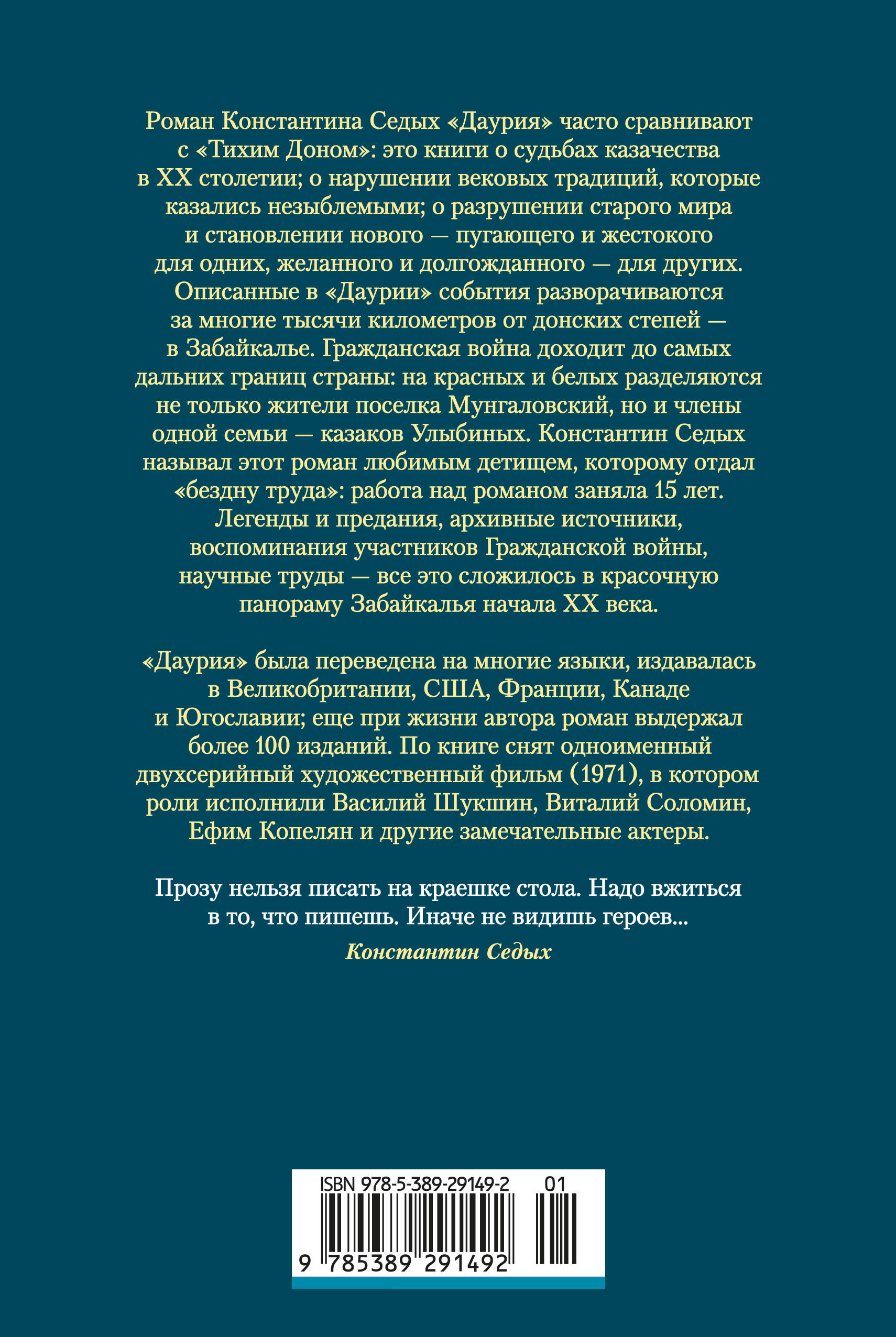 «Даурию» часто сравнивают с «Тихим Доном»: это книги о судьбах казачества в XX столетии; о нарушении вековых традиций, которые казались незыблемыми; о разрушении старого мира и становлении нового — пугающего и жестокого для одних, желанного и долгожданного — для других. Описанные в «Даурии» события разворачиваются за многие тысячи километров от донских степей — в Забайкалье. Гражданская война доходит до самых дальних границ страны: на красных и белых разделяются не только жители станицы Мунгаловской, но и члены одной семьи — казаков Улыбиных. Константин Седых называл этот роман любимым детищем, которому отдал «бездну труда»: работа над романом заняла 15 лет. Легенды и предания, архивные источники, воспоминания участников Гражданской войны, научные труды — всё это сложилось в красочную панораму Забайкалья начала XX века. «Даурия» была переведена на многие языки, издавалась в Великобритании, США, Франции, Канаде и Югославии; еще при жизни автора роман выдержал более 100 изданий. По книге снят одноименный двухсерийный художественный фильм (1971), в котором роли исполнили Василий Шукшин, Виталий Соломин, Ефим Копелян и другие замечательные актеры.