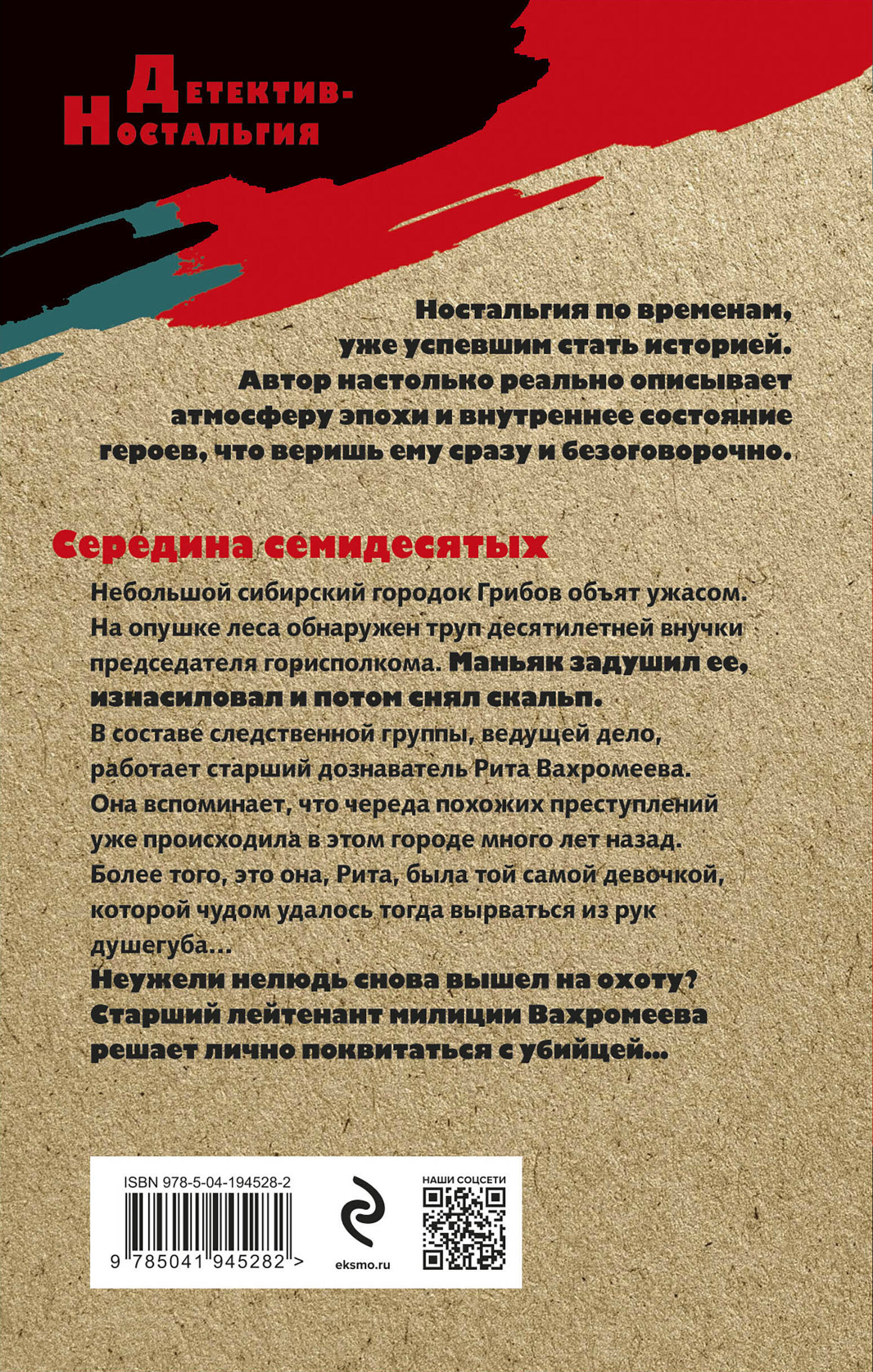 Середина семидесятых. Небольшой сибирский городок Грибов объят ужасом. На опушке леса обнаружен труп десятилетней внучки председателя горисполкома. Маньяк задушил ее, изнасиловал и потом снял скальп. В составе следственной группы, ведущей дело, работает старший дознаватель Рита Вахромеева. Она вспоминает, что череда похожих преступлений уже происходила в этом городе много лет назад. Более того, это она, Рита, была той самой девочкой, которой чудом удалось тогда вырваться из рук душегуба… Неужели нелюдь снова выше на охоту? Старший лейтенант милиции Вахромеева решает лично поквитаться с убийцей…