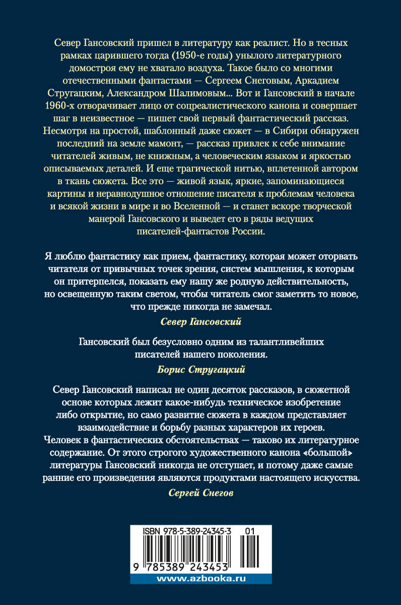 Север Гансовский пришел в литературу как реалист. Но в тесных рамках царившего тогда (1950-е годы) унылого литературного домостроя ему не хватало воздуха. Такое было со многими отечественными фантастами — Сергей Снегов, Аркадий Стругацкий, Александр Шалимов… Вот и Гансовский в начале 1960-х отворачивает лицо от соцреалистического канона и совершает шаг в неизвестное — пишет свой первый фантастический рассказ. Несмотря на простой, шаблонный даже сюжет — в Сибири обнаружен последний на земле мамонт, — рассказ привлек к себе внимание читателей живым, не книжным, а человеческим языком и яркостью описываемых деталей. И еще трагической нитью, вплетенной автором в ткань сюжета. Все это — живой язык, яркие, запоминающиеся картины и неравнодушное отношение писателя к проблемам человека и всякой жизни в мире и во Вселенной — и станет вскоре творческой манерой Гансовского и выведет его в ряды ведущих писателей-фантастов России.