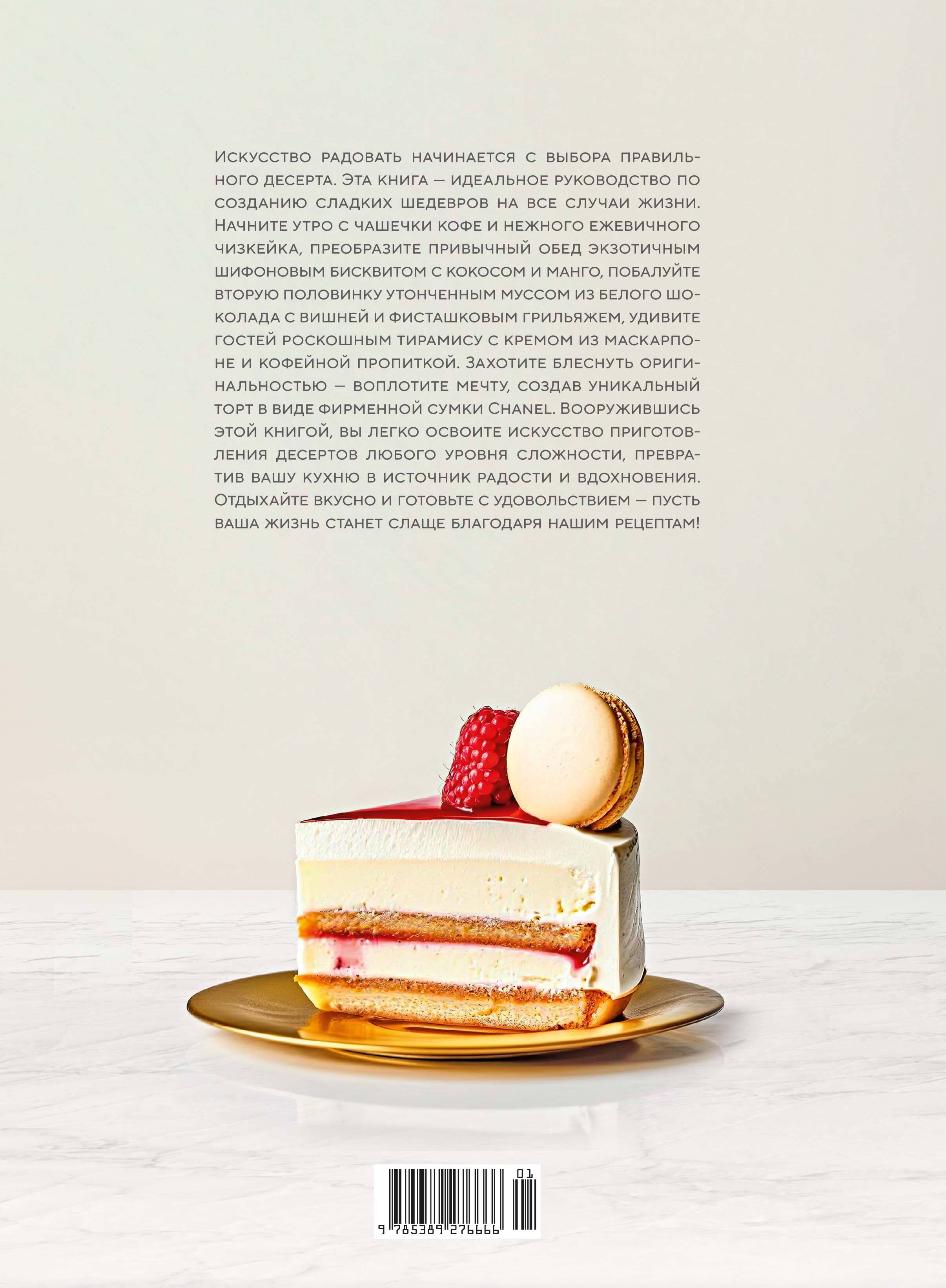 Искусство радовать начинается с выбора правильного десерта. Эта книга — идеальное руководство по созданию сладких шедевров на все случаи жизни. Начните утро с чашечки кофе и нежного песочного кольца с лимонным кремом, преобразите привычный обед экзотичным шафранным бисквитом с кокосом и манго, устройте романтический вечер с утончённым муссом из белого шоколада с вишней и фисташковым грильяжем, удивите гостей роскошным тирамису с кремом из маскарпоне и кофейной пропиткой. Захотите блеснуть оригинальностью — воплотите мечту, создав уникальный торт в виде фирменной сумки Chanel. Вооружившись этой книгой, вы легко освоите искусство приготовления десертов любого уровня сложности, превратив вашу кухню в источник радости и вдохновения. Отдыхайте вкусно и готовьте с удовольствием — пусть ваша жизнь станет слаще благодаря нашим рецептам!