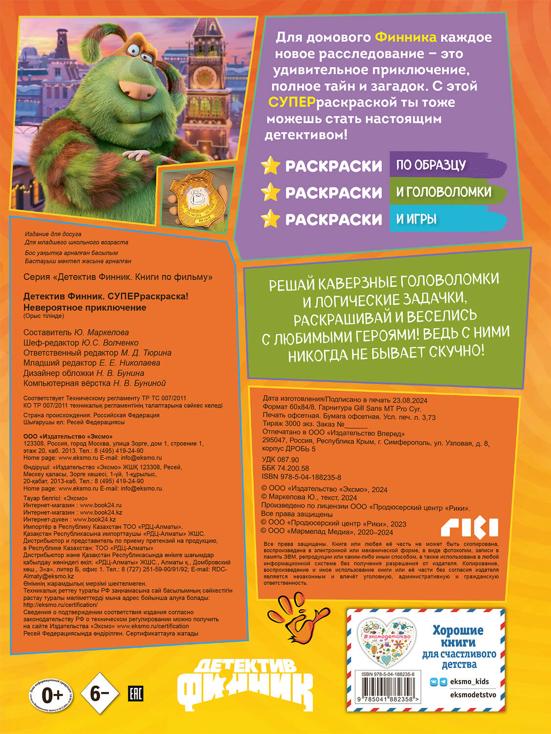 Уникальная и невероятно красочная суперраскраска для всех поклонников «Детектива Финника»! Хочешь поближе познакомиться с любимыми героями? На страницах книги ты не только встретишь их всех, но и найдешь много раскрасок и рисовалок, занимательных головоломок, лабиринтов, судоку, кроссвордов и других интересных игр. Прояви свою фантазию, находчивость и внимательность! Яркая суперраскраска обязательно понравится маленькому любителю популярного мультсериала и станет замечательным подарком на день рождения и любой другой праздник.