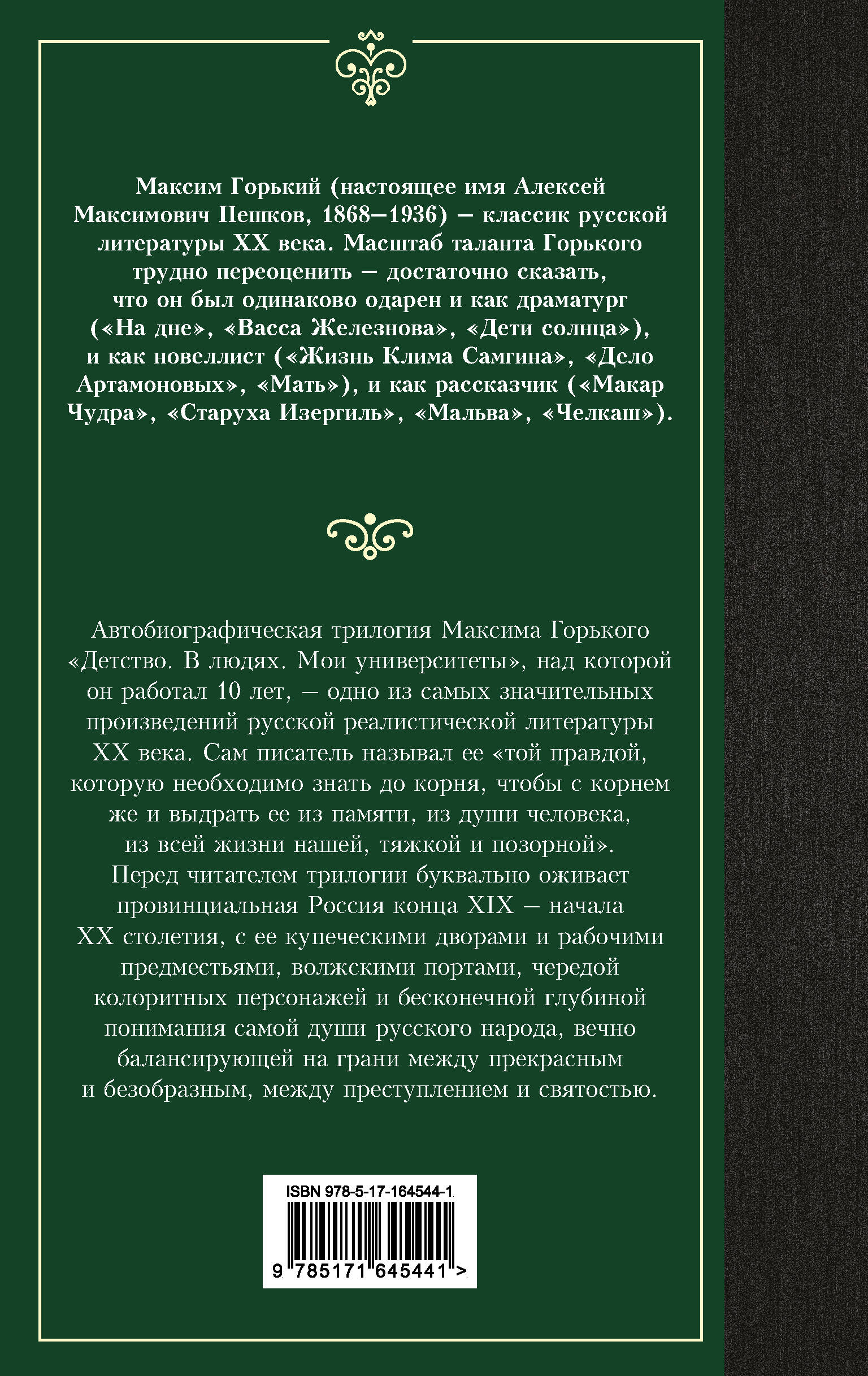 Автобиографическая трилогия Максима Горького "Детство. В людях. Мои университеты", над которой он работал 10 лет, – одно из самых значительных произведений русской реалистической литературы ХХ века. Сам писатель называл ее "той правдой, которую необходимо знать до корня, чтобы с корнем же и выдрать ее из памяти, из души человека, из всей жизни нашей, тяжкой и позорной".