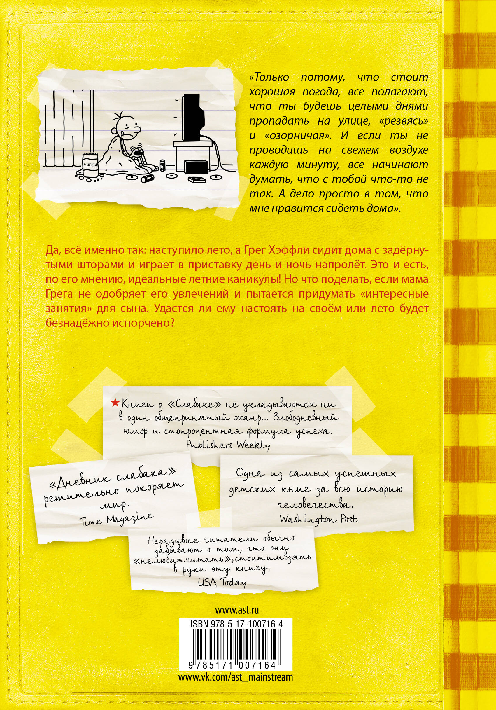 Первая же книга Джеффа Кинни из серии «Дневник слабака» стала бестселлером New York Times, была экранизирована и принесла своему автору славу одного из самых многообещающих детских писателей. Благодаря успеху следующих книг Кинни занял место в списке ста самых влиятельных людей мира по версии журнала Time. Но главное - завоевал сердца десятков миллионов юных поклонников по всему миру. Секрет такого успеха заключается, во-первых, в фигуре Грега Хэффли, главного героя цикла. Он обычный школьник, не надуманный и не сказочный, с такими понятными и знакомыми всем проблемами, страхами, переживаниями и мечтами. Во-вторых, в живом и ироничном языке, обилии остроумных наблюдений и веселых заметок. Ну, а в-третьих - в замечательных иллюстрациях, которые являются неотъемлемой частью повествования и напрямую включены в сюжет. Недаром Джефф Кинни - не только всемирно известный писатель, но и талантливый карикатурист. В книге «Собачья жизнь» собрано все то, из-за чего цикл «Дневник слабака» стал настоящим мировым бестселлером. Это все тот же легкий слог, море остроумия, смешные иллюстрации и, конечно, неунывающий Грег Хэффли. На этот раз Грег переживает удивительные приключения во время летних каникул. Здесь будет и поездка в аквапарк всей семьей, и безуспешная попытка разбогатеть, и даже появление в доме собаки. Скучать не придется!