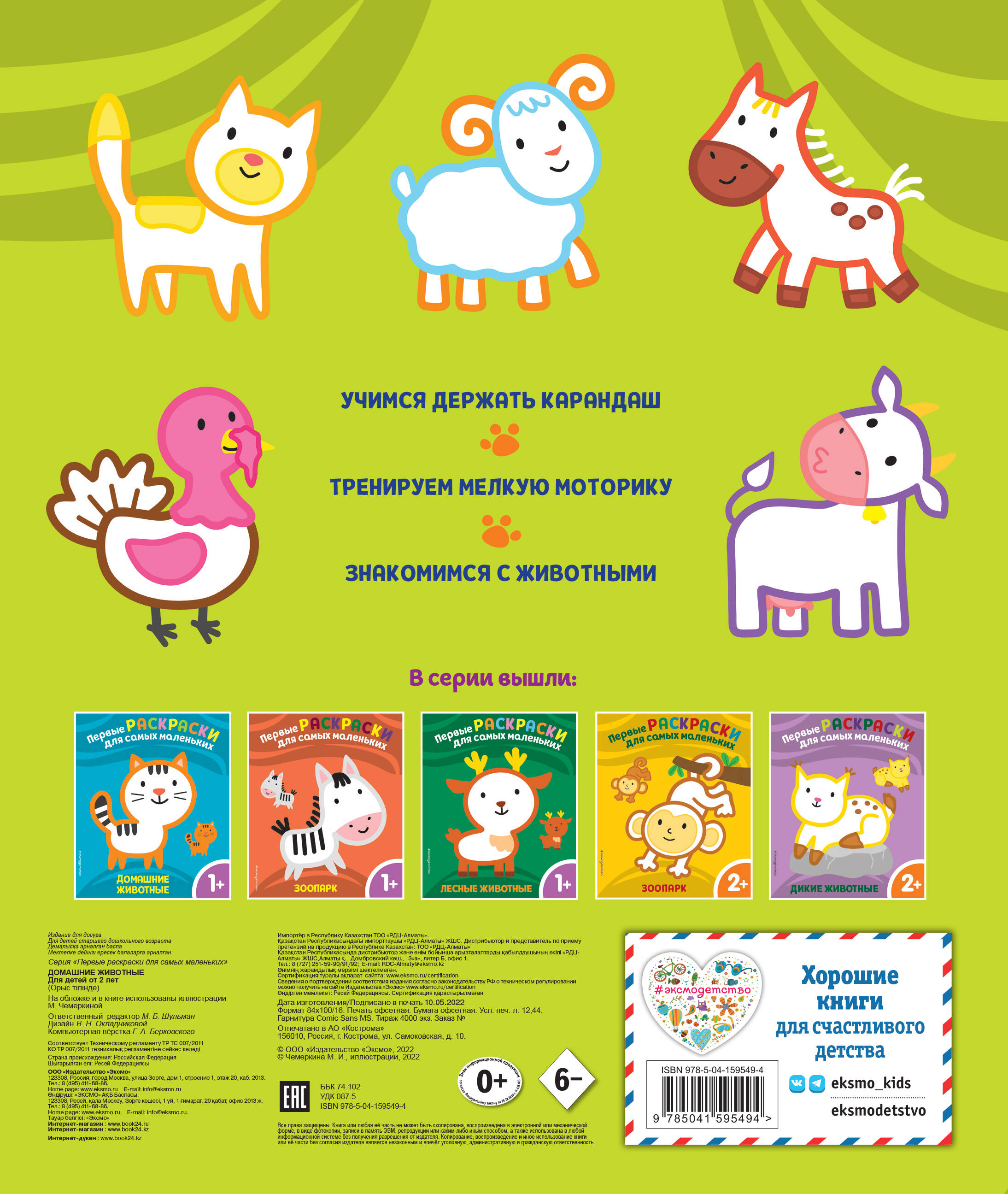 Отличный выбор первых раскрасок для вашего ребёнка! Цветной фон, простое раскрашивание в один или два цвета, наличие цветного образца, очаровательные зверюшки — всё это сделает ваше времяпрепровождение с этой книжкой весёлым и полезным.