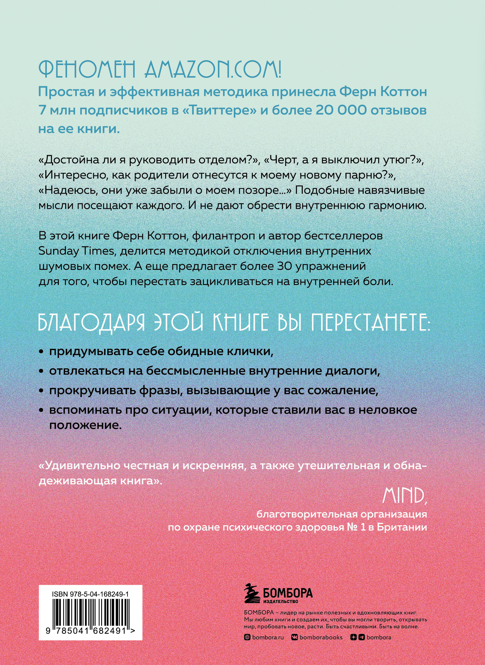 В этой книге Ферн Коттон, филантроп и автор бестселлеров Sunday Times, делится методикой отключения внутренних шумовых помех. А еще предлагает более 30 упражнений для того, чтобы перестать зацикливаться на внутренней боли.