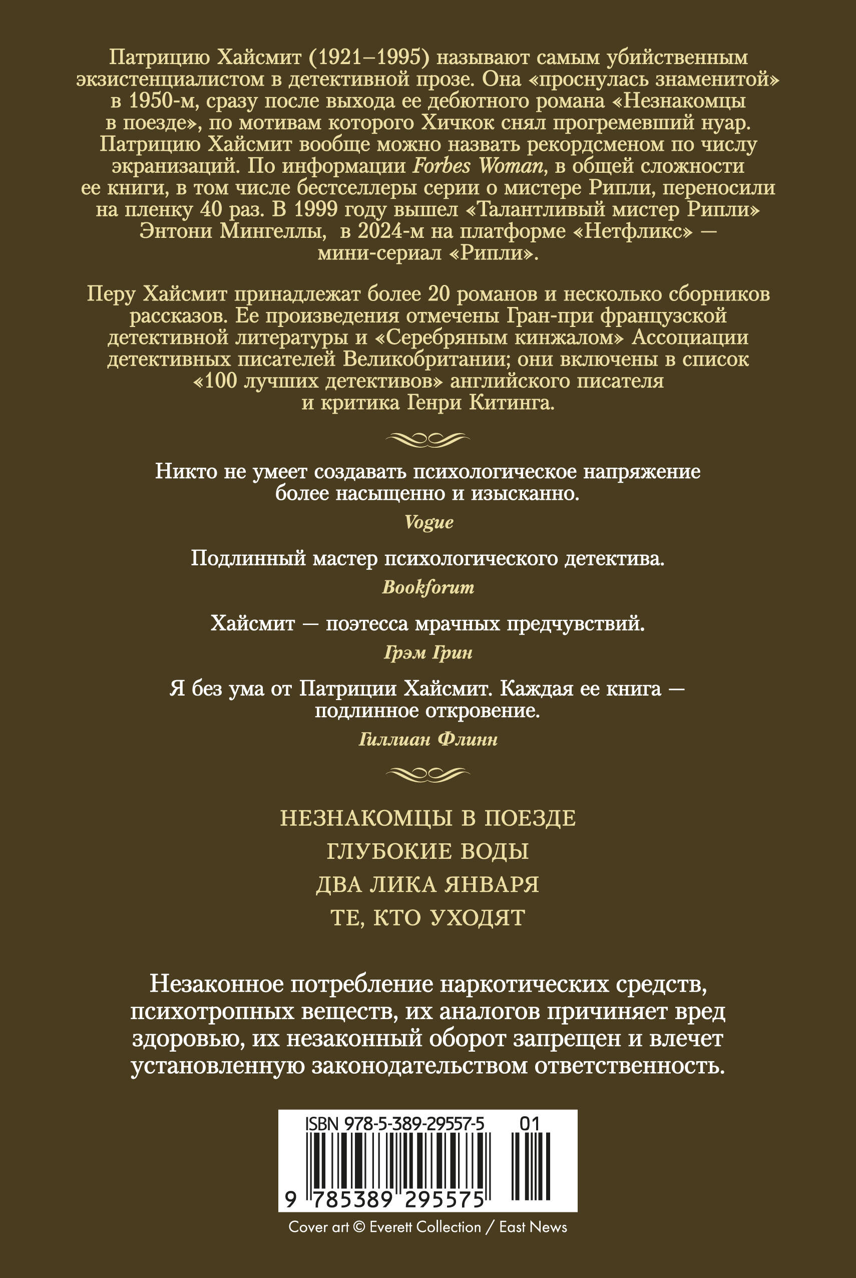 «Любите вы детективы или нет, но „Глубокие воды“ — обязательное чтение» (Sunday Times). Герой, уставший терпеть измены жены, однажды выдумывает историю убийства... Роман был экранизирован в 1981-м и 2022 году (режиссер Эдриан Лайн, в главной роли Бен Аффлек).