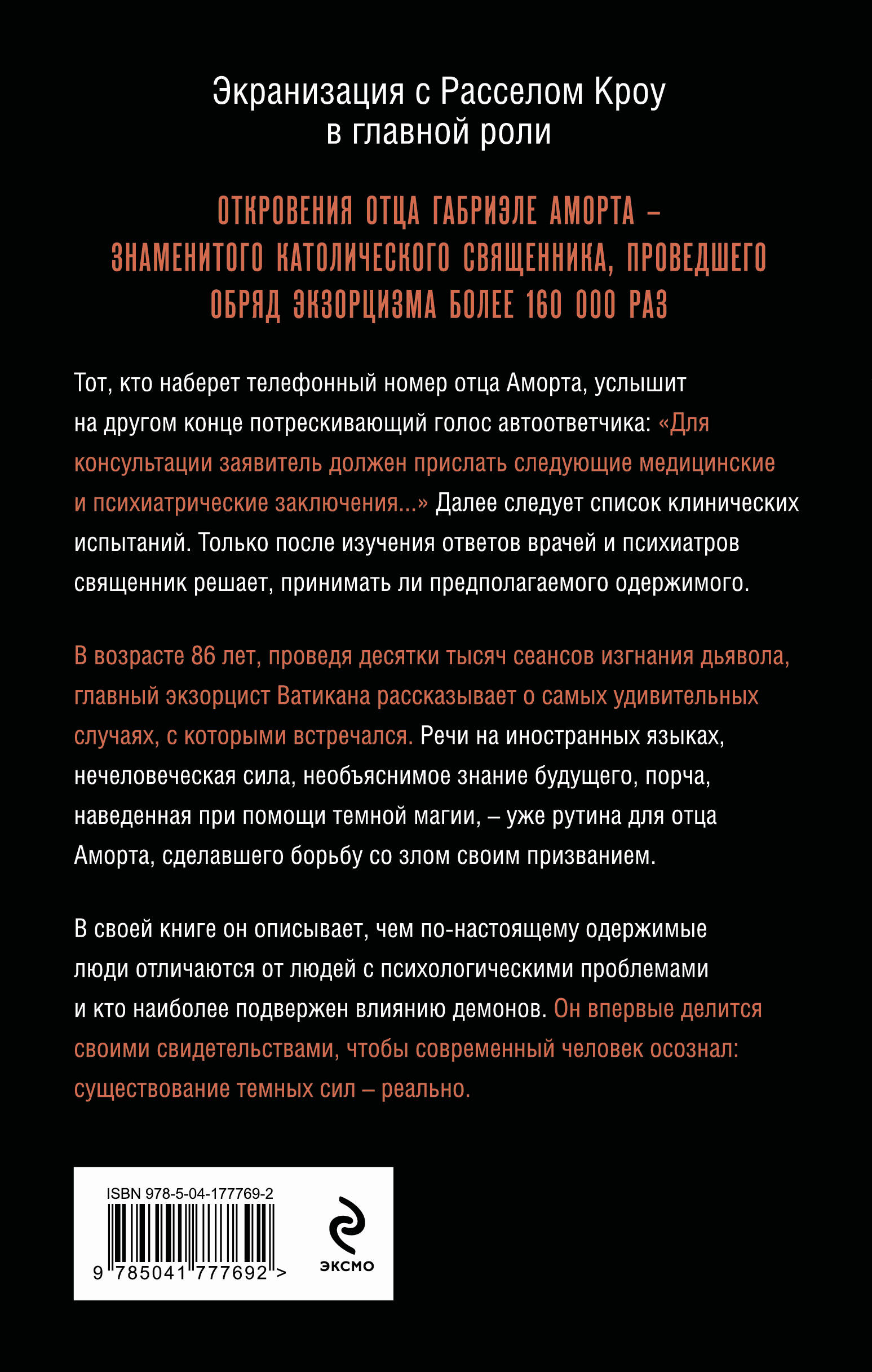 В возрасте 86 лет, проведя десятки тысяч сеансов изгнания дьявола, главный экзорцист Ватикана рассказывает о самых интересных случаях, с которыми он встречался. Речи на иностранных языках, нечеловеческая сила, левитация, необъяснимое знание будущего, порча, наведенная при помощи темной магии — уже рутина для отца Аморта. В своей книге он описывает, чем по-настоящему одержимые люди отличаются от людей с психологическими проблемами и кто наиболее подвержен влиянию демонических сил.