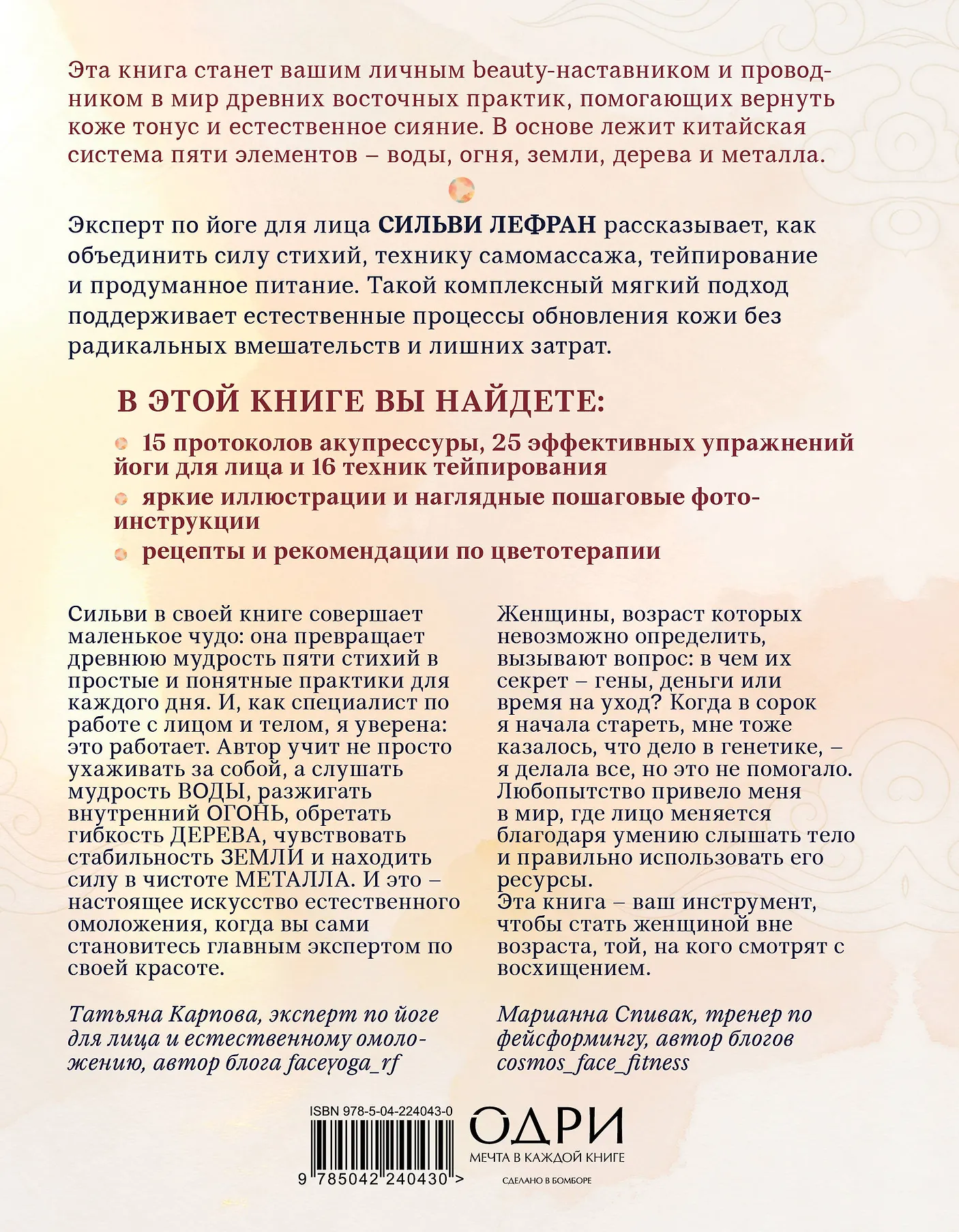 Это практическое руководство по естественному омоложению кожи, вдохновленное китайской системой пяти элементов. Эксперт по йоге для лица и тейпированию Сильви Лефран объединяет древнюю восточную мудрость и современные beauty-методы, чтобы пробудить природную энергию красоты. Вы узнаете, как взаимодействуют пять стихий, как они отражаются на вашем лице и внутреннем состоянии и как, мягко восстанавливая баланс, можно поддерживать упругость и тонус кожи.