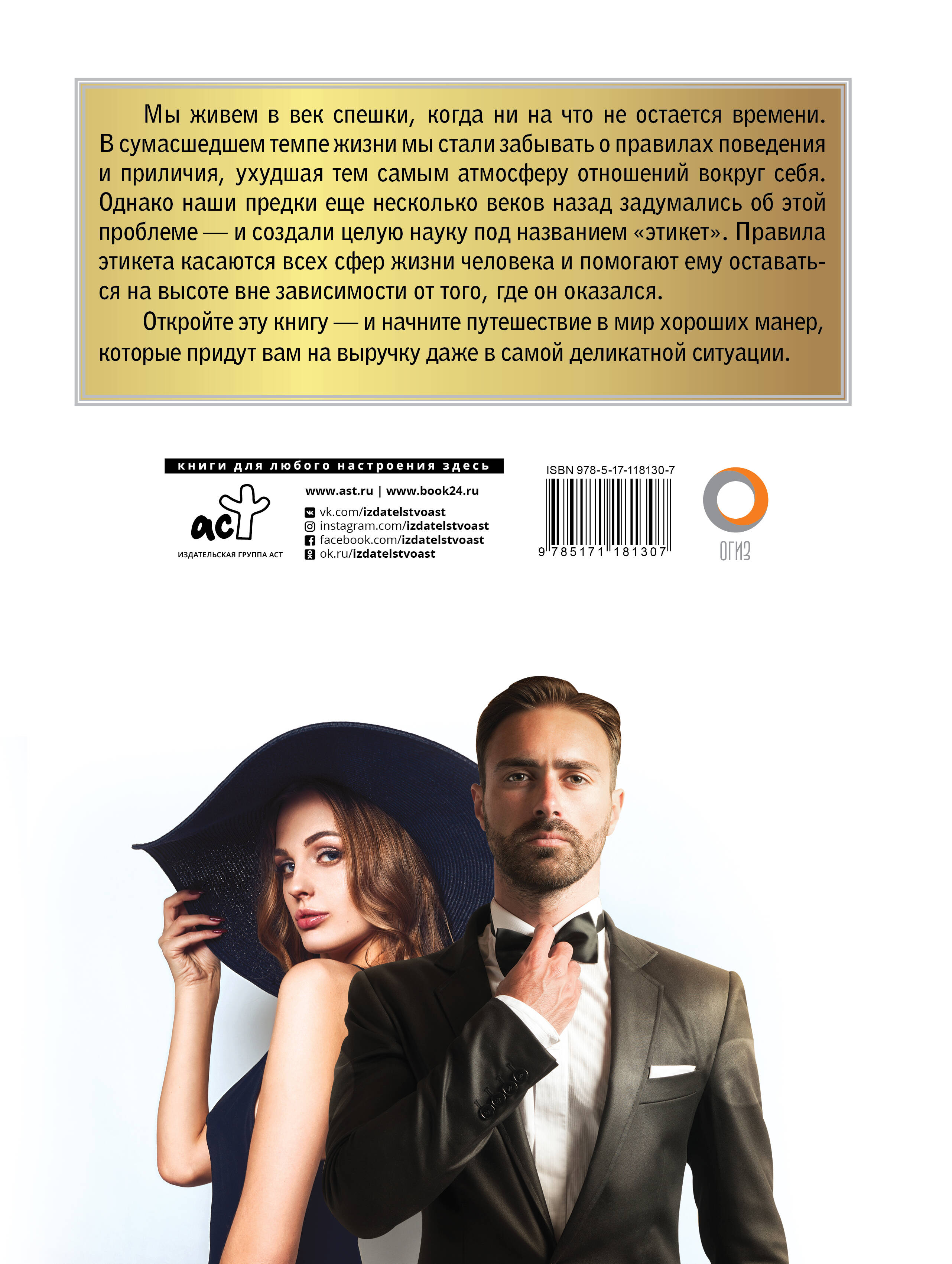 Мы живем в век спешки, когда ни на что не остается времени. В сумасшедшем темпе жизни мы стали забывать о правилах поведения и приличия, ухудшая тем самым атмосферу отношений вокруг себя. Однако наши предки еще несколько веков назад задумались об этой проблеме — и создали целую науку под названием "этикет". Правила этикета касаются всех сфер жизни человека и помогают ему оставаться на высоте вне зависимости от того, где он оказался.