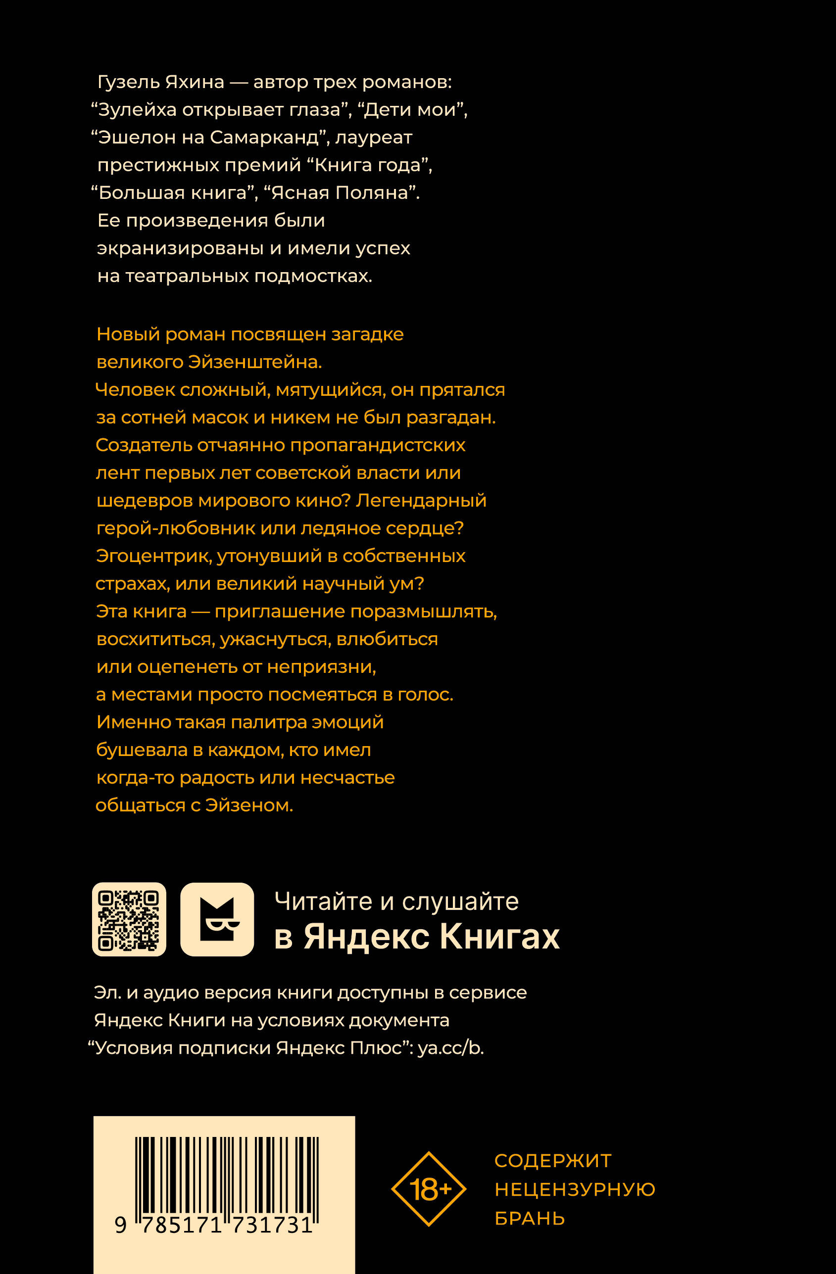 Новый роман посвящен загадке великого Эйзенштейна. Человек сложный, мятущийся, он прятался за сотней масок и никем не был разгадан. Создатель отчаянно пропагандистских лент первых лет советской власти или шедевров мирового кино? Легендарный герой-любовник или ледяное сердце? Эгоцентрик, утонувший в собственных страхах, или великий научный ум?