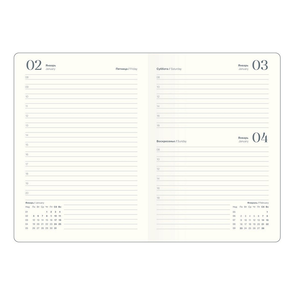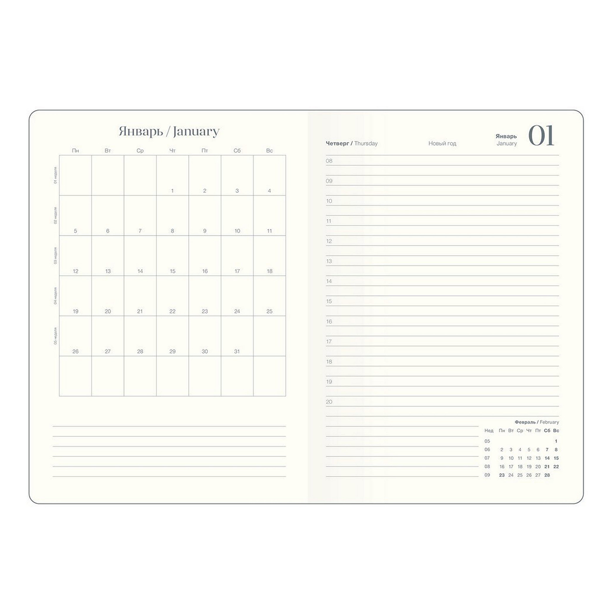 Обложка - интегральная, фактурная искусственная кожа с печатью по кожзаму, скругленные уголки, цвет - белый. Блок - датированный, 352 стр., кармашек, 2 ляссе, бумага: слоновая кость, 70 г/м2, печать 1+1. Особенности: тиснение золотой фольгой, золотой прокрас обреза блока.